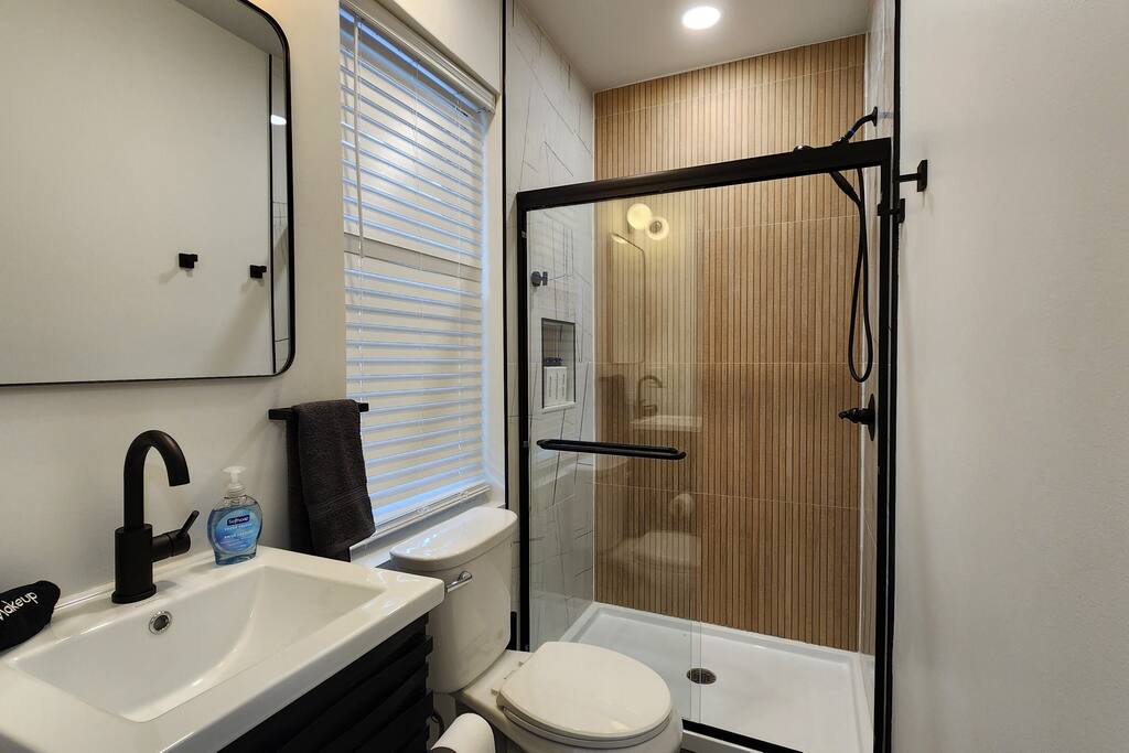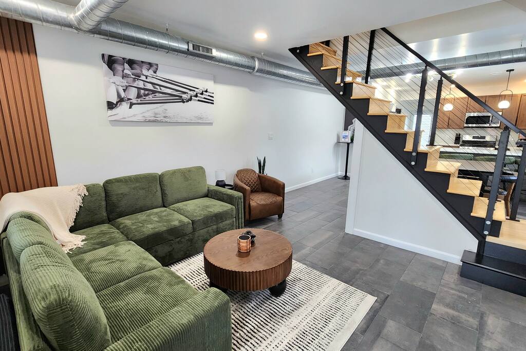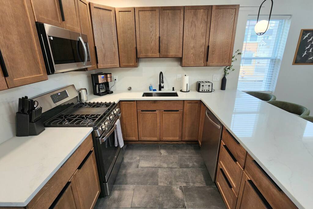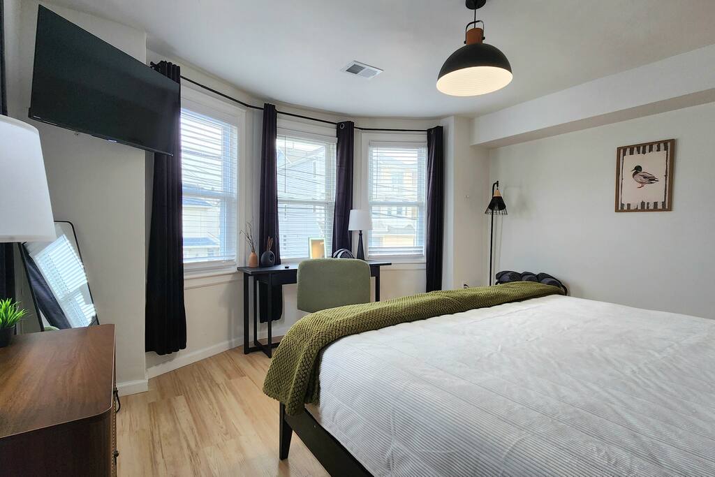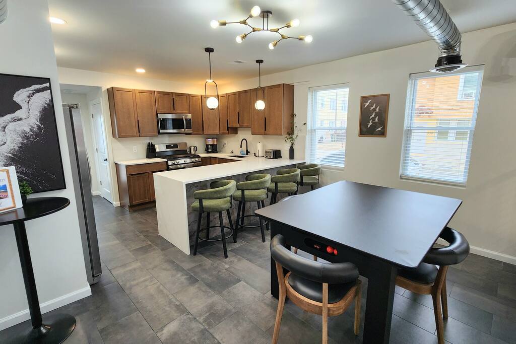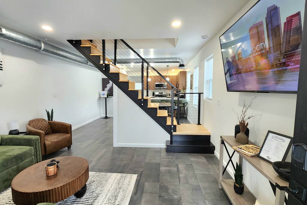 LIVING ROOM – Cozy seating, pull out sofa, and a large Smart TV (streaming apps only) – In between the kitchen and living room is a dining table that converts into a bumper pool table, which has seating for 4 KITCHEN – Newly updated with modern appliances and a large quartz island with seating for four BEDROOM 1- 1 King Sized bed, Smart TV, BEDROOM 2- 1 Queen Sized bed, Smart TV BEDROOM 3- 1 Queen Sized bed, Smart TV BATHROOMS: (2 baths total) – Full bath located in the upstairs hallway, with a bathtub and shower combo. – Full bath on the main level located next to the back door and kitchen, with a walk-in shower. ROOFTOP: – Enjoy city views from the rooftop deck with seating, ideal for morning coffee, evening drinks, or unwinding outdoors. – Accessible from the back of the property by 2 spiral staircases. AMENITIES: – This home is ideal for families or groups and is equipped with WiFi, a washer and dryer, smart TV's with streaming apps for your viewing pleasure (no cable, just streaming apps), a combination drip and keurig coffee maker, an iron and ironing board, a hair dryer and much more! BOOK WITH US and unlock discounts and special offers exclusive to Cozy Cohost guests. Take advantage of all that Atlantic City has to offer and enjoy savings at top local spots including famous restaurants, night clubs, spas, coffee shops, distilleries, breweries, boat tours, bike rentals, mini golf, and more...