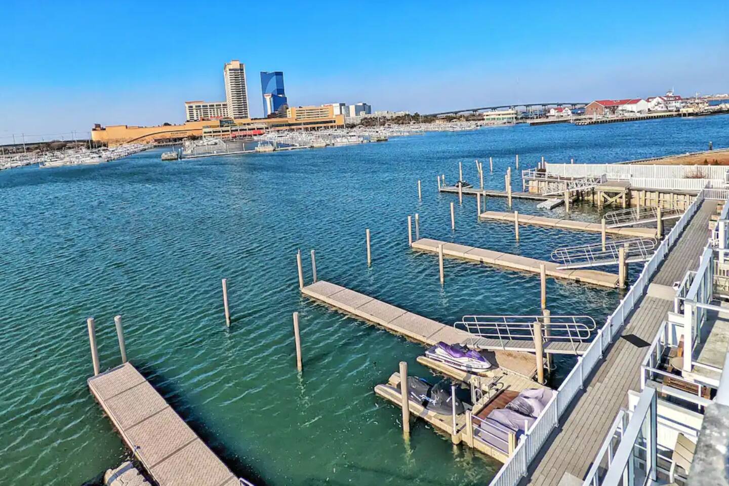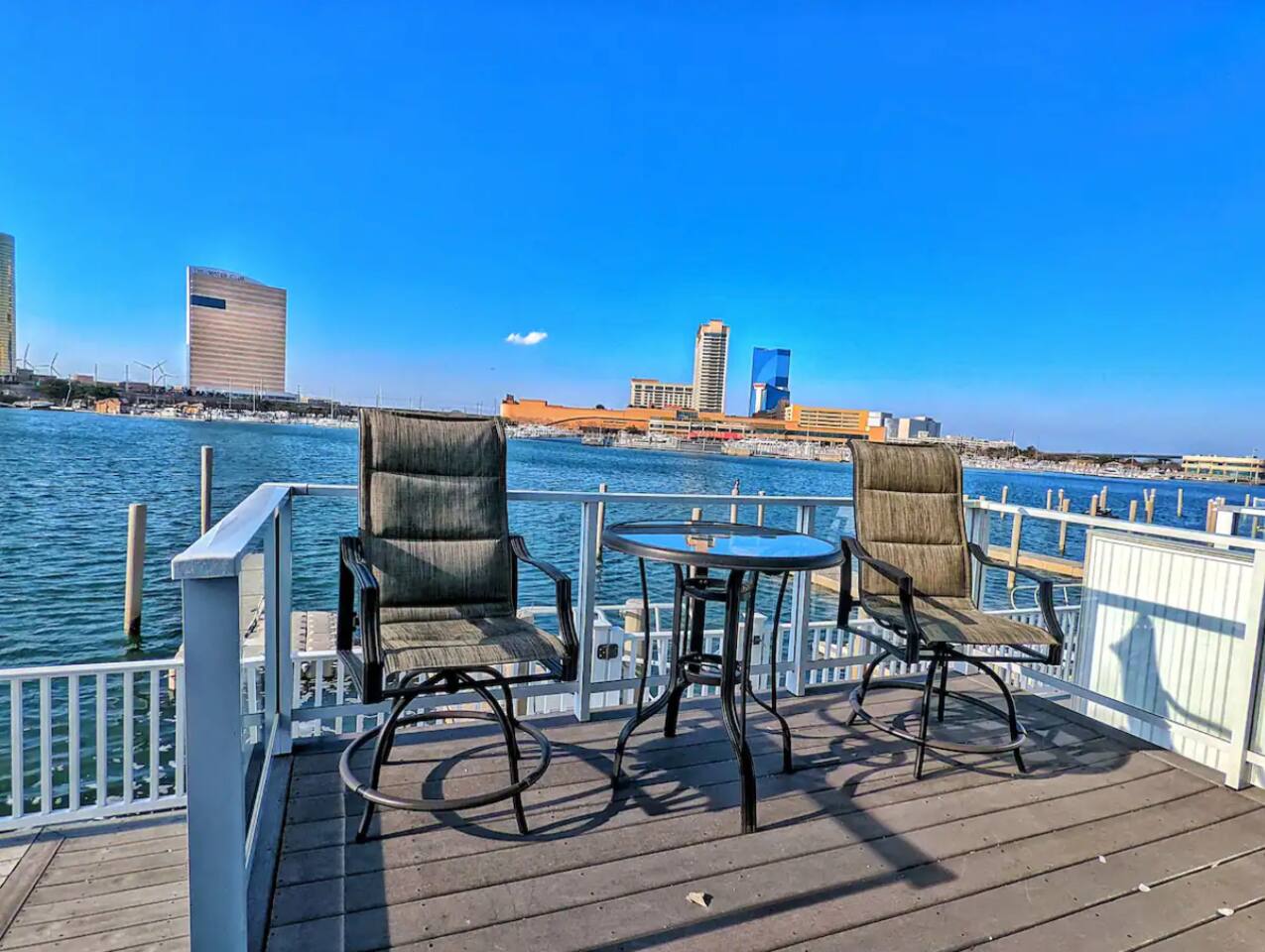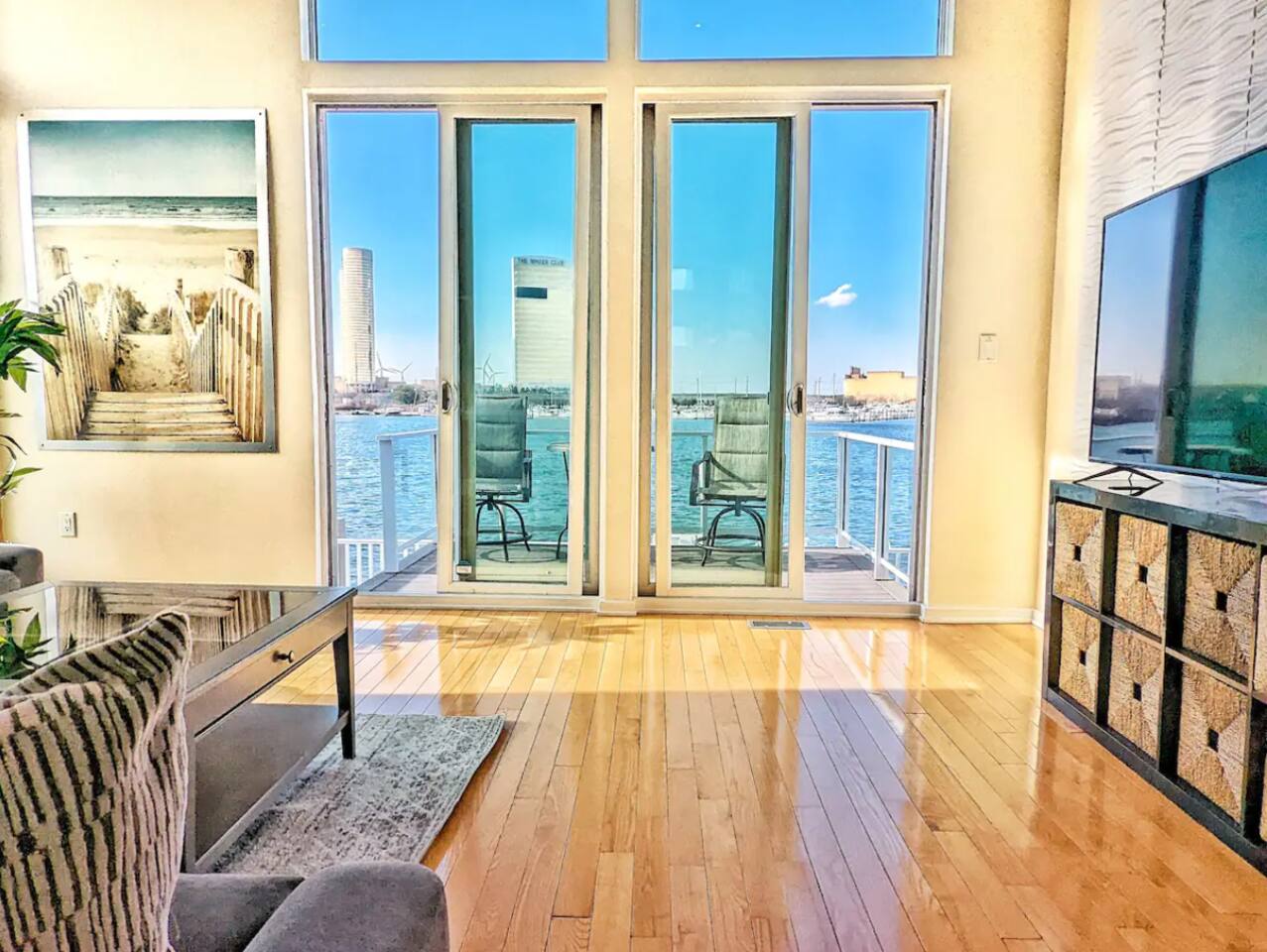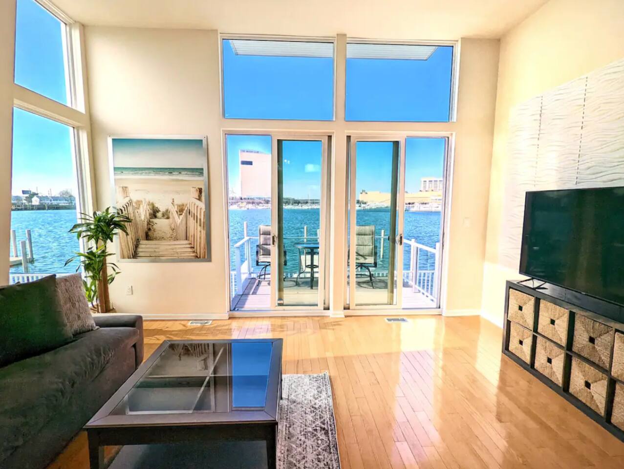 This beautiful bay front home will be sure to please! This bay front beauty comes with its own dock for all your water toys. Come enjoy the salt life in Atlantic City. With tasteful style and a view of the water from the bay front deck, this space is a perfect location for a family or group to soak up all the best that Atlantic City has to offer. Enjoy the contemporary design accompanied by modern amenities that spread across this entire elegant house. While decorating this inviting retreat, we have worked hard to create a feeling of a second home for our guests. Healthy natural light warms up space during the day by shining through large glass windows. SLEEPING ARRANGEMENTS: BEDROOM 1 - King Bed w/ en suite full bath, TV BEDROOM 2 - Queen bed w/ en suite full bath, TV BEDROOM 3 - Bunk bed (with Twin and a full) w/ en suite full bath, TV BATHROOMS: -Every bedroom has an attached full bathroom. -There is a half bathroom off of the kitchen KITCHEN: -Fully stocked with new appliances. -A great kitchen to cook a meal, then step out onto a bay front deck on each floor to enjoy the fresh air, sun, and passing boats. AMENITIES: The home is also equipped with Wifi, a coffee maker, hair dryer, and much more! BOOK WITH US and unlock discounts and special offers exclusive to Cozy Cohost guests. Take advantage of all that Atlantic City has to offer and enjoy savings at top local spots including famous restaurants, night clubs, spas, coffee shops, distilleries, breweries, boat tours, bike rentals, mini golf, and more...