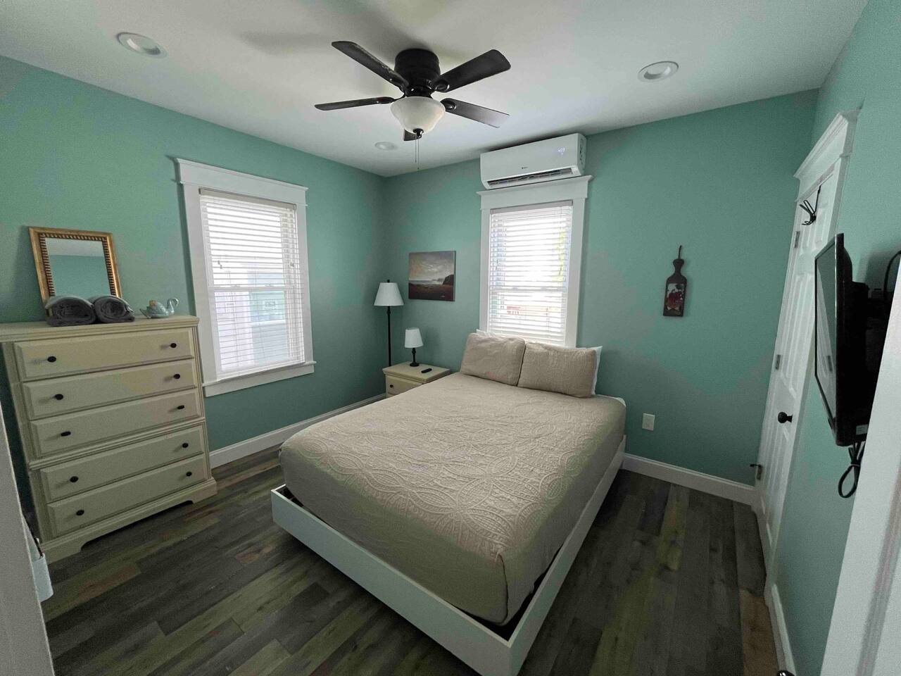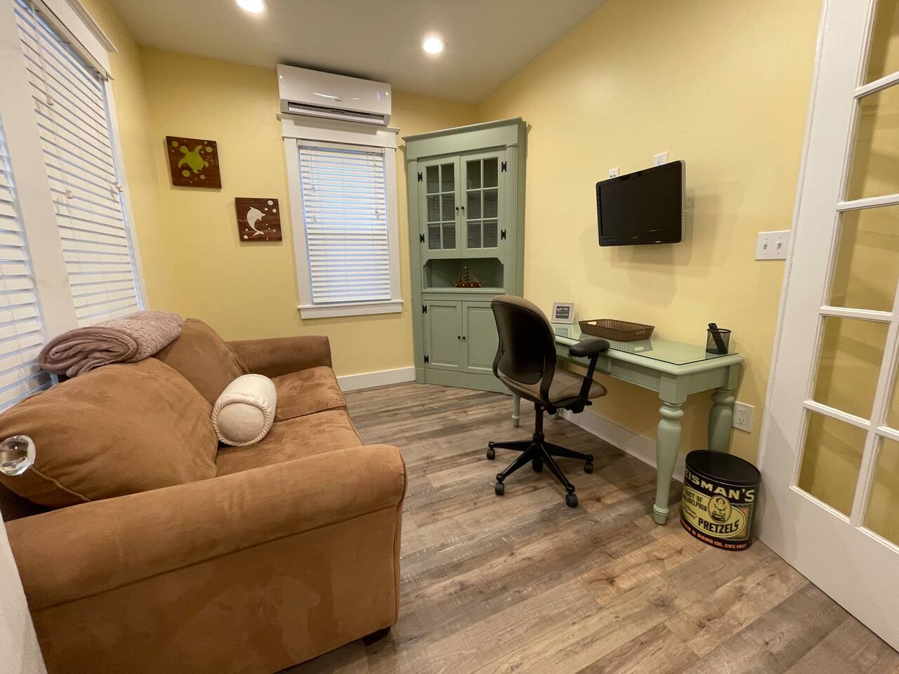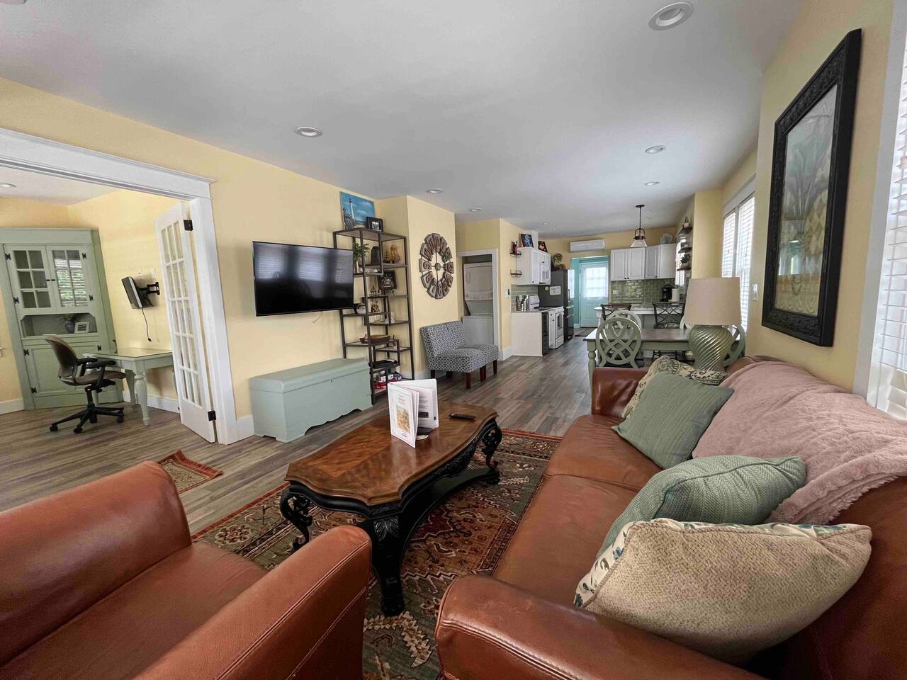 Kick back & relax in this calm, stylish 2 bedroom, 2 bathroom open floor cottage. Each bedroom features a queen sized bed & wall-mounted smart TVs. There is also a converted attic with 2 twin beds, perfect for children! The home is perfect to unwind & chill out. Make a nice meal in the kitchen, enjoy the spacious living area, work remote in the private office, enjoy the several backyard amenities or the newly added separate lounge garage hang out space! Close to all that AC has to offer!