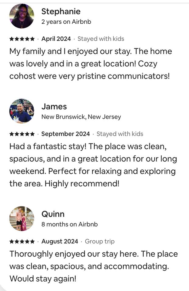 We take pride in offering a comfortable and enjoyable stay. Please review and follow our house rules to ensure a great experience. – Cozy Cohost LLC HOUSE RULES BOOKING & GUESTS Must be 21+ to book. The booking guest must check in and stay the entire duration. Only registered guests are allowed. Unapproved guests will incur a $200 fee per person. RESPECT FOR NEIGHBORS & NOISE No parties or events. Unauthorized gatherings will result in immediate removal without a refund. Quiet hours: 10 PM – 7 AM. No loud music after 10 PM (Atlantic City noise ordinance). CHECK-OUT & CLEANLINESS Check-out on time to allow for cleaning. Unauthorized late check-outs may incur fees. Keep the property clean. No glitter, confetti, or tape on walls. Additional cleaning fees apply for damages, excessive mess, or soiled items. SMOKING, FIRE SAFETY & PROPERTY CARE No smoking or drugs indoors. A $250 fee applies for violations. No open flames, candles, or wax. No hair dye. Only flush toilet paper—no wipes, paper towels, or other materials. SECURITY & RESPONSIBILITY Lock doors and windows when leaving. Missing or damaged items will be charged: Bath Towel – $10 | Sheets – $25 | Comforter – $50 | Pillow – $10 | Throw Blanket – $20 We are not responsible for lost items. If found, a $25 handling fee + shipping applies. Unclaimed items after five days will be donated. AMENITIES & SUPPLIES Basic essentials are provided. Once they run out, guests must purchase additional supplies. One bath towel per guest is provided. Request extras before check-in. VIOLATIONS & PENALTIES Violations may result in: Denied entry or immediate removal without refund Additional fees for damages, unapproved guests, or rule violations BY BOOKING, you agree to these rules. Thank you for your cooperation!