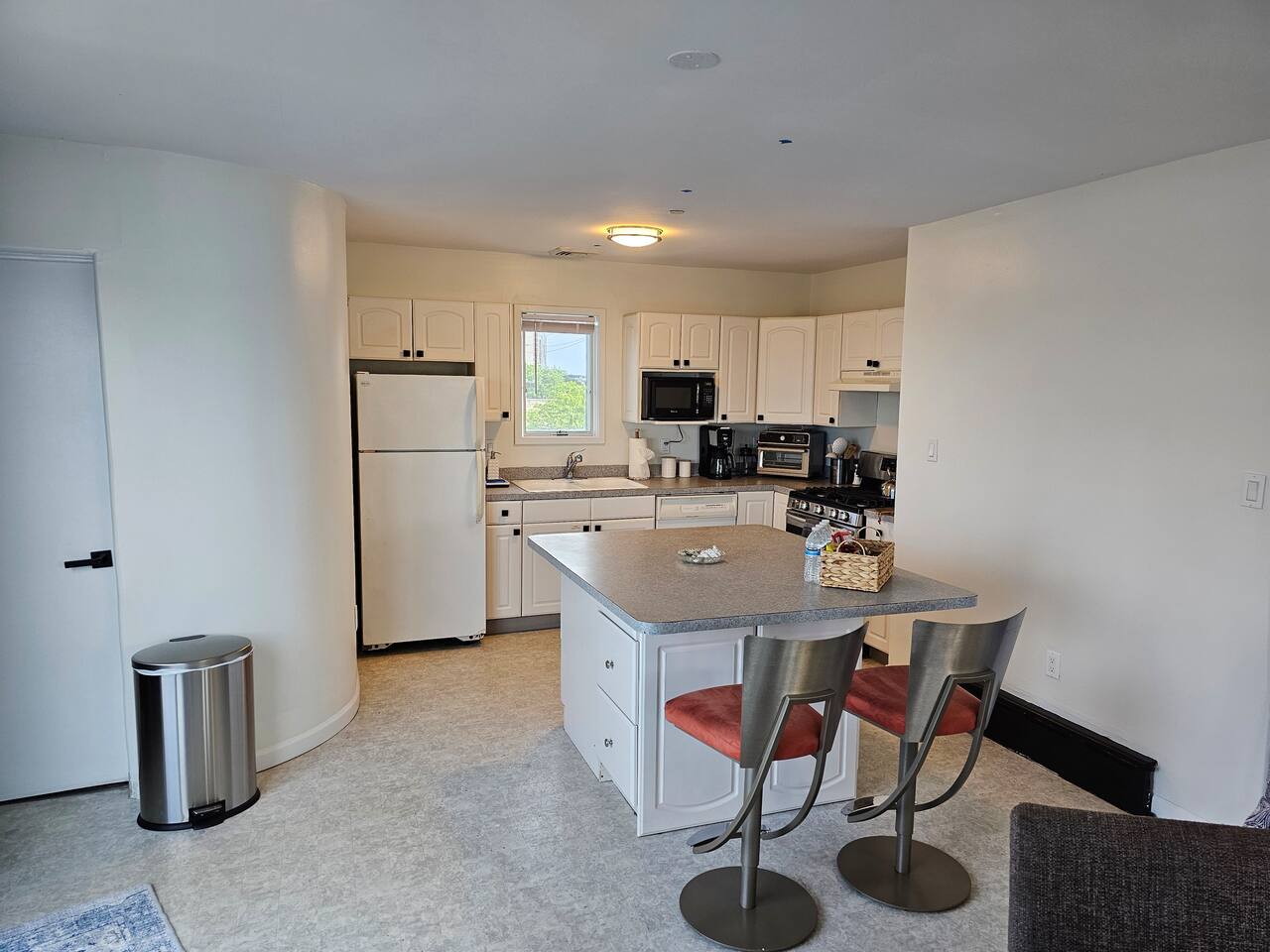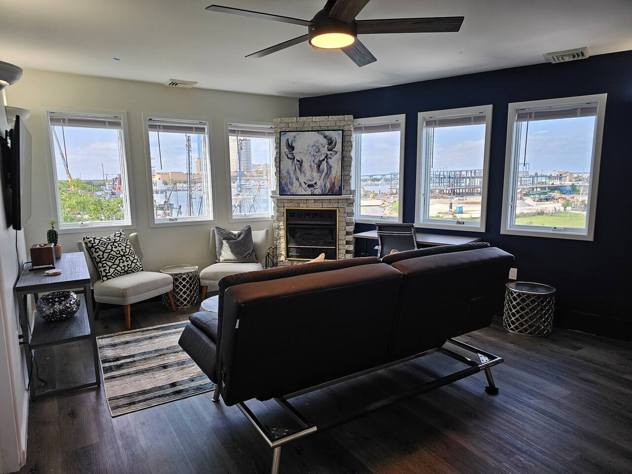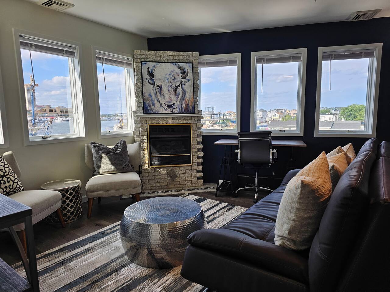 This penthouse is located in a waterfront marina building that also includes another separate rental unit on the lower floors. This listing is for the top-floor 1-bedroom, 1-bath penthouse apartment, offering elevated privacy and beautiful marina views. Step out onto your private balcony and take in peaceful waterfront scenery overlooking Atlantic City’s marina. The open-concept layout connects the living room, dining area, and kitchen, creating a bright and comfortable space designed for relaxing stays. The living area includes a sofa bed, TV, and indoor fireplace, making it perfect for cozy evenings in. The dining table seats four, with additional seating at the kitchen counter. The kitchen is fully equipped for preparing meals, and a washer and dryer are conveniently located inside the unit. The bedroom features a queen-size bed, and the full bathroom is located just off the main living area for easy access.