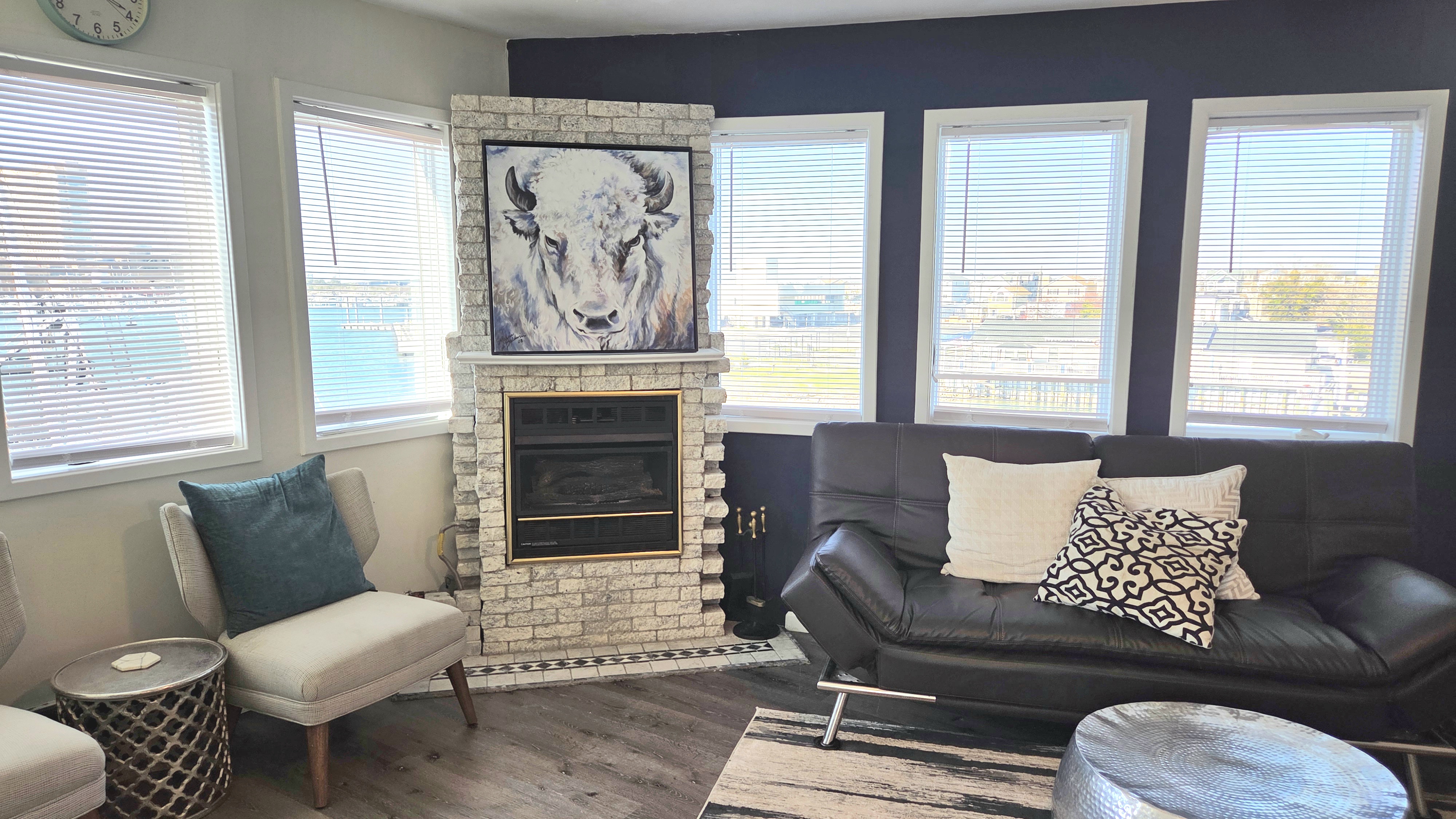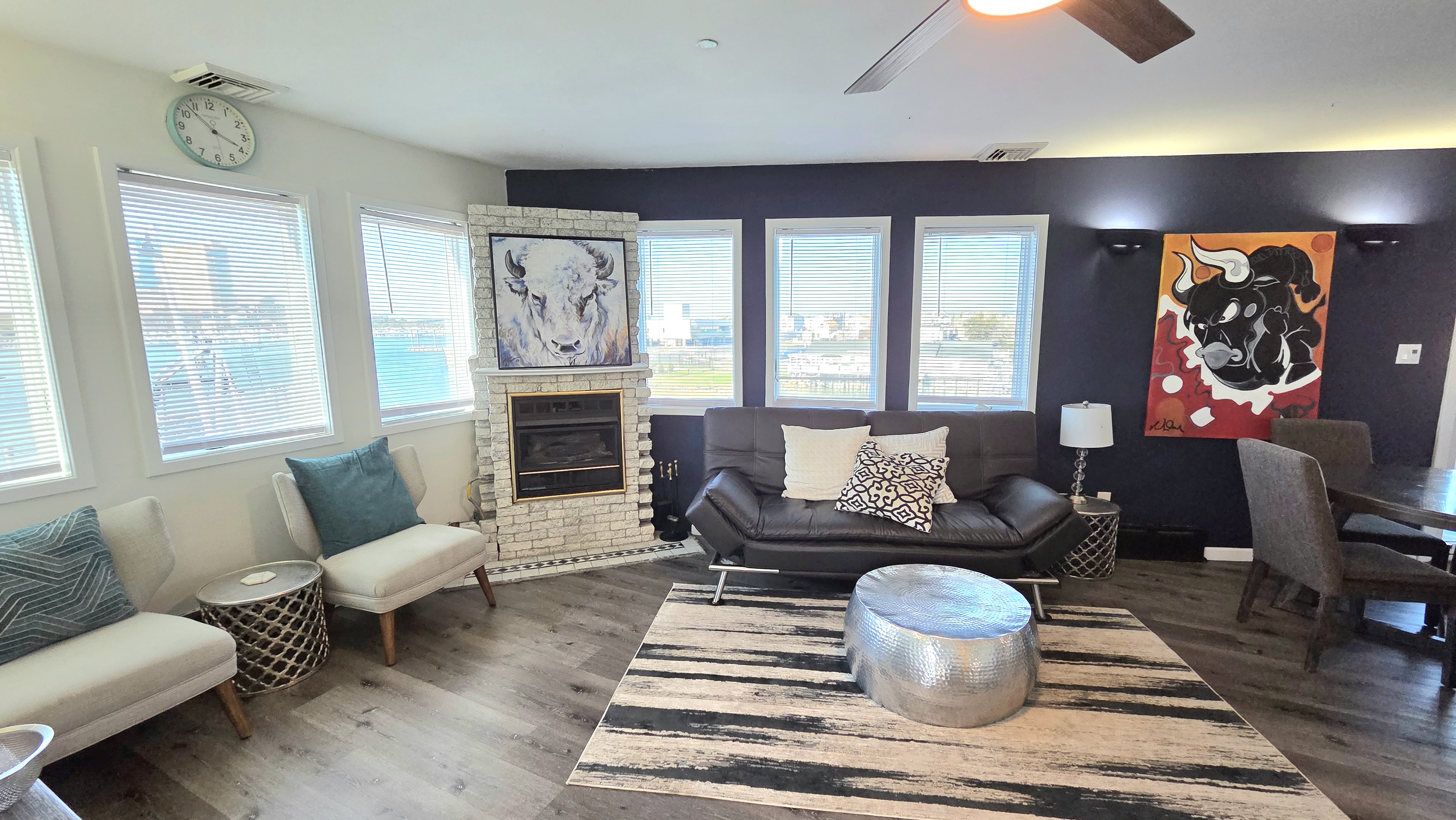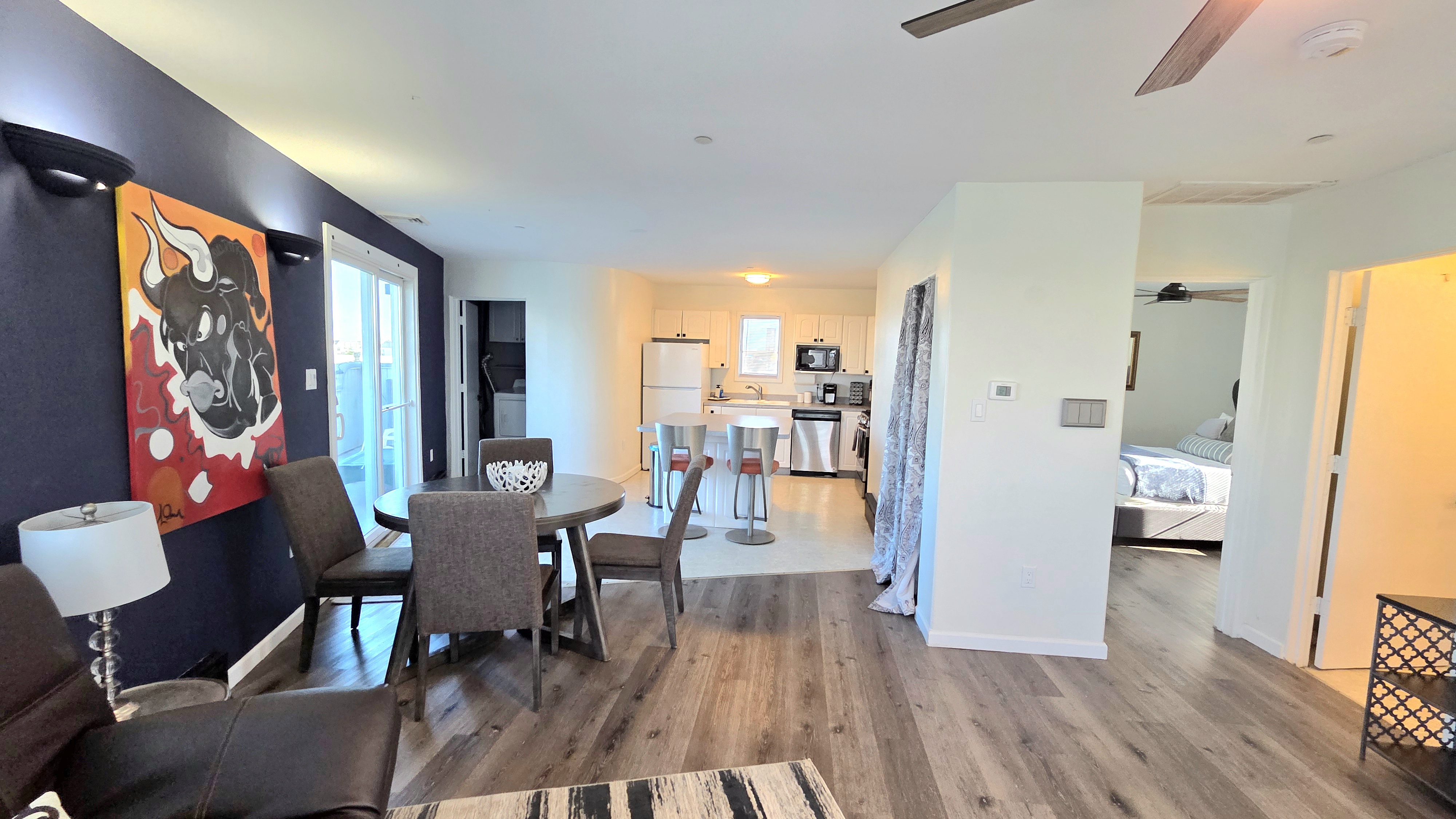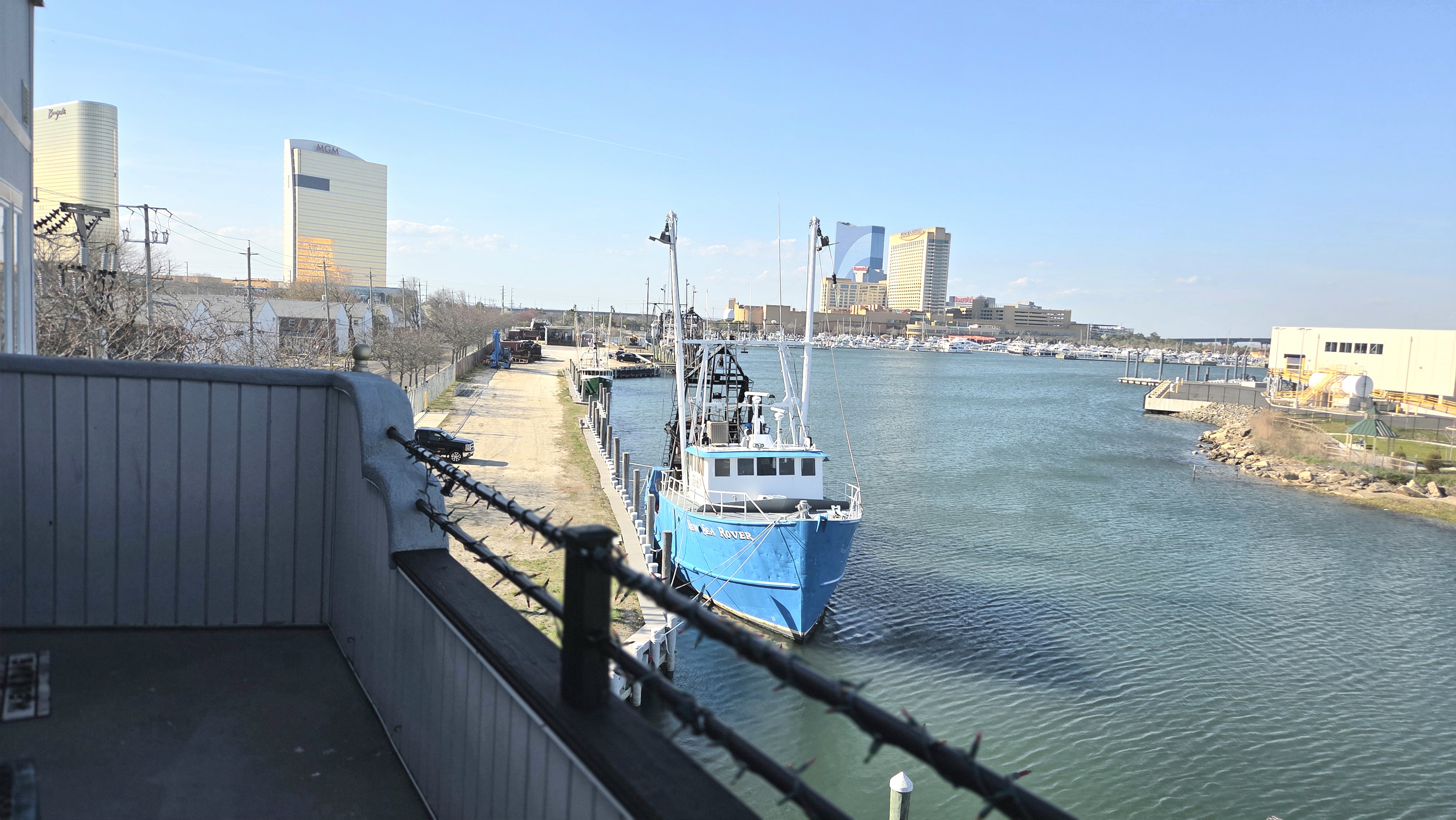This penthouse is located in a waterfront marina building that also includes another separate rental unit on the lower floors. This listing is for the top-floor 1-bedroom, 1-bath penthouse apartment, offering elevated privacy and beautiful marina views. Step out onto your private balcony and take in peaceful waterfront scenery overlooking Atlantic City’s marina. The open-concept layout connects the living room, dining area, and kitchen, creating a bright and comfortable space designed for relaxing stays. The living area includes a sofa bed, TV, and indoor fireplace, making it perfect for cozy evenings in. The dining table seats four, with additional seating at the kitchen counter. The kitchen is fully equipped for preparing meals, and a washer and dryer are conveniently located inside the unit. The bedroom features a queen-size bed, and the full bathroom is located just off the main living area for easy access. The second bed is a fold down futon/sofa in the livingroom space.