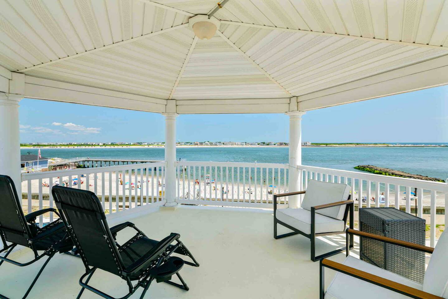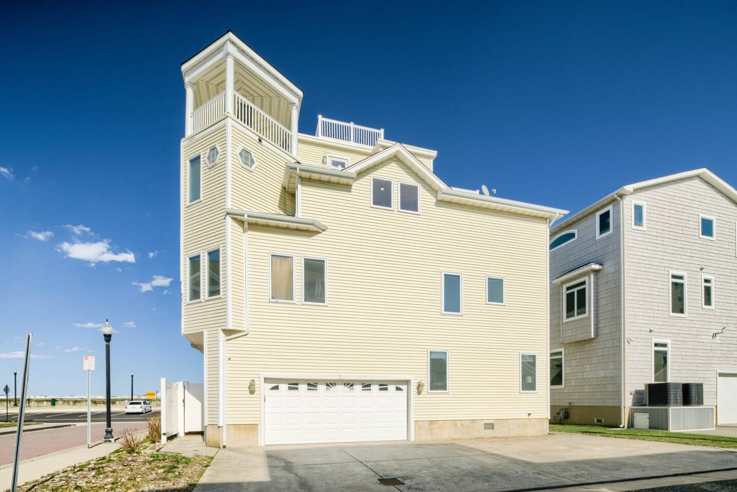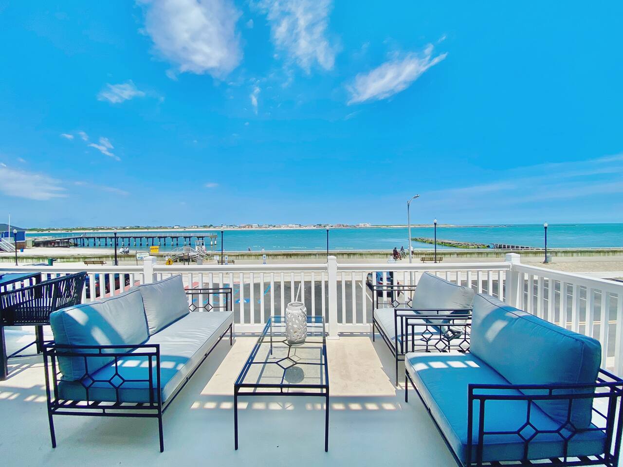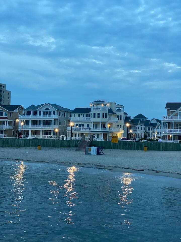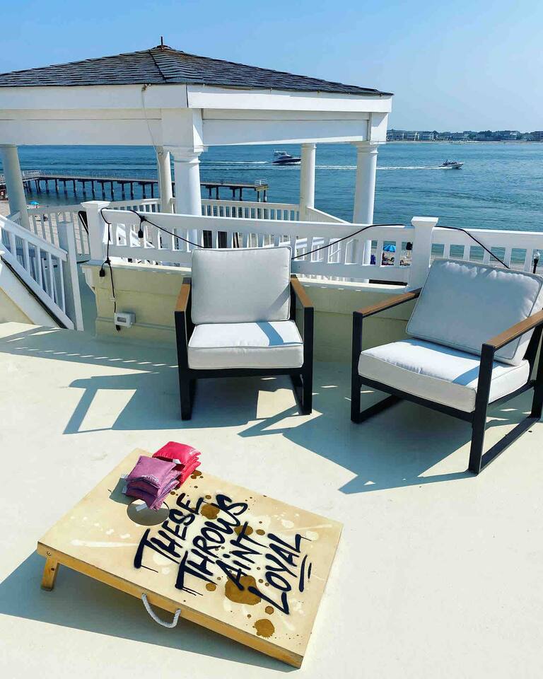 Wake up to the sound of waves, take in a rooftop sunrise, then make your way to the beach or spend your time on the private roof top. This is one of the most unique homes in AC. While this property looks like a hotel or bed and breakfast from the outside, the whole house is yours to enjoy a few days of relaxation and unparalleled beautiful views. This is truly one of the most unique beachfront homes in all of Atlantic City and the surrounding areas. Located steps from the beach entrance, it doesn’t get any more convenient. 6 bedrooms and 4.5 bathrooms and an outdoor shower. The layout is as follows.. FIRST FLOOR: -Foyer with travertine tile and grand crystal chandelier. -Bedroom 1: King bed, Queen sleeper, full length mirrors, private terrace. Sleeps 4. -Bedroom 2: King bed, Twin bed, large walk in closet, 1 rollaway memory foam bed (in closet). Sleeps 4. -Bedroom 3- two Queen beds, floor to ceiling mirrors. Sleeps 4. -Bathroom 1- double vanity, tub/shower combo. -Bathroom 2- shower stall, laundry, private toilet. -Garage for storage with a couple bikes and beach chairs (guests are still encouraged to bring their own). SECOND FLOOR: -Open concept living/dining/kitchen. -Bathroom 3- Half bathroom/powder room off of entertaining space. -Bar with wine fridge and ice maker (so helpful when you have a large group). -Wrap around balcony with ample seating and amazing views. Grill for your use (guests are responsible for their own propane and for cleaning the grill following their usage. Failure can result in an additional grill cleaning fee). -Bedroom 4- Suite w/ bathroom. King bed, Twin bed, ceiling fan, floor to ceiling mirrors, bathroom with jacuzzi jet tub, separate shower, double vanity, private toilet. Sleeps 3. THIRD FLOOR SUITE: -Bedroom 5/Bath 5- 1,200 sq ft room with tons of windows and views of the water, King bed (facing the water), dining area, Twin bed (in separate small space with a door), sectional, 55" smart tv, pool table, 2 balconies overlooking the ocean. Sleeps 3. -Large walk in shower with rain shower head, double vanity, large 2 person jacuzzi tub with water views. -Large laundry room with washer, dryer, iron. FOURTH FLOOR: -1000 sq ft roof top with unparalleled views of the ocean, inlet, Brigantine bridge and the city's ONLY crow's nest with incredible 360 degree views. WEDDINGS/EVENTS: -This is the perfect home for family reunions, small weddings, bachelorettes, or just a relaxing weekend away. -If you are interested in weddings or events but our calendar isn't open that far in advance, we can open it up for you. -Additional fees apply to weddings and events along with a separate contract. -No more than 20 guests without prior approval in writing. PETS: -Brand new carpet installed in 2021 therefore we respectfully have to decline pets. BOOK WITH US and unlock discounts and special offers exclusive to Cozy Cohost guests. Take advantage of all that Atlantic City has to offer and enjoy savings at top local spots including famous restaurants, night clubs, spas, coffee shops, distilleries, breweries, boat tours, bike rentals, mini golf, and more...