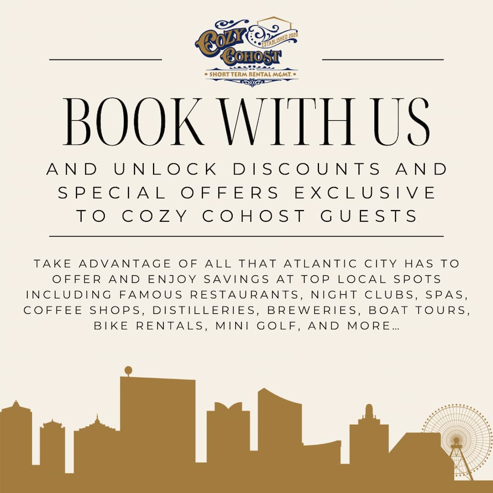 HONESTY & EXPECTATIONS: At "Seaside Grand Escape", we want our guests to have a clear understanding of the distinctions between vacation rentals and hotels. While we diligently maintain our properties, wear and tear are inherent aspects of vacation rentals. Although we address issues promptly, the high volume of guests may result in occasional delays between stays. Any significant damage or serious concerns are prioritized and resolved before a guest's check-in, provided we are made aware of the issue. CLEANING: Our dedicated cleaning team meticulously sanitizes and cleans each home. Unlike standard hotel rooms, homes entail a more detailed cleaning process due to their larger size. Despite our team's efforts to ensure optimal cleanliness, minor oversights may occur. For substantial errors, we are committed to rectifying the situation promptly. While we take pride in our cleaning standards, we ask for understanding that, as in any human endeavor, perfection is not always attainable, especially when minor details have no direct impact on your stay. HOUSEHOLD ITEMS: As private residences, it's important to recognize that household items may break or require repairs during your stay. While we understand the inconvenience this may pose to our guests, it's equally disruptive for us. Appliances such as water tanks, HVAC systems, dishwashers, and refrigerators may experience issues. We cannot guarantee immunity from such occurrences, but we pledge to address and resolve any situation swiftly. While we assure our commitment to guests' well-being, we're honest about the potential for unforeseen issues. AMENITIES: -WiFi included; exterior ring camera security for added safety. -Linens, towels, and basic amenities provided. -Guests must purchase their own amenities when stock runs out. -No laundry detergent is provided. -Basic cookware supplies; no salt, pepper, oil, or kitchen condiments. RESERVATION/CANCELLATION NOTES: -If your dates are booked, please ask about our other listings. -Changing reservation dates or guest quantity may incur additional fees. -Rates/prices subject to change based on reservation adjustments. -Guests may request to change booking dates up to 14 days before check-in, subject to availability and possible rate differences. Within 14 days, date changes are not guaranteed and may be treated as a cancellation. -Cancellation policy WILL apply if reservation is cancelled. Please review before booking. -Airbnb Trip Protection suggested for added coverage. OTHER DETAILS: We are always happy to welcome families! Please note that the property is not childproof, and children must be always supervised by an adult for safety. -Atlantic City is a barrier island and city style environment; expect possible common sightings of household ants, critters or mice especially during certain times of the years. Properties are not immune to household issues like this and may have evidence of preventative treatments and measures. -Beaches are free; no tags or passes required. Beach amenities not provided. -We utilize quilts on most of our beddings for comfort, durability, and sanitary reasons. If extra blankets are needed, let us know before check-in. -If you are extremely sensitive to smells, please note that odors from food, smoke, or other sources from outside or neighboring units may occasionally be noticeable. If this is a major concern for you, please keep this in mind. ADDITIONAL INFORMATION: -Respectful behavior requested due to close proximity of homes. -This is NOT a party house. City-wide quiet hours from 10pm-7am. -We ask that you please respect the neighbors, the neighborhood and the home. -Please monitor noise levels, especially during the night. -You must be 21 and over to book. -We ask that you please read the house rules and listing in full when booking. OUR COMMITMENT: We strive to provide each guest with a 5-star experience, enabling them to truly enjoy their getaways. However, we acknowledge that achieving absolute perfection in a private residence may be unrealistic. If a flawless experience is your expectation, a vacation property rental might not align with your preferences. Our aim is to be transparent, manage expectations, and ensure a comfortable stay for all our valued guests. We live in the city and are available 24/7 for your guest services. - Cozy Cohost LLC
