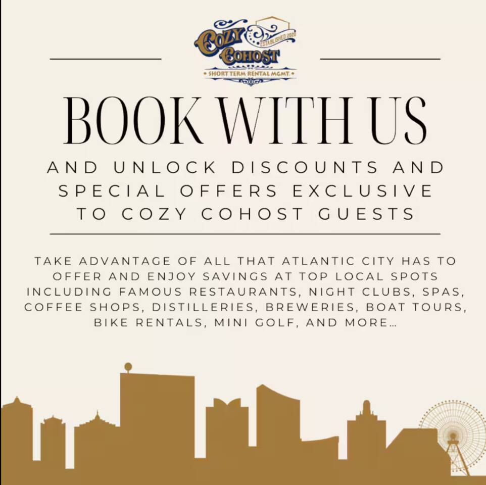 The home is cozy and perfect for a comfortable retreat! Just minutes away from the beach, boardwalk, Gardner's Basin, and all the hustle and bustle of Atlantic City. FRONT EXTERIOR: There is a front porch, nice for sitting outside to get some fresh air or to enjoy a morning cup of coffee. MAIN LEVEL: -LIVING ROOM AND DINING AREA: There is a large smart TV and roomy seating area in the living room (There is no cable for the TVs, just streaming apps). The dining table accommodates 6. -KITCHEN: Equipped with appliances and basic cookware. -BEDROOM 1 - Queen Bed with Smart TV -BATHROOM: 1 Full Bath with Tub/Shower -LAUNDRY ROOM: for your convenient laundry needs SECOND LEVEL: -BEDROOM 1: 1 Queen Sized Bed & Smart TV -BEDROOM 2: 1 Queen Sized Bed & Smart TV (There is no cable for the TVs just streaming apps) -BATHROOM: 1 Full Bath with Tub/Shower GARAGE: Guests may use the garage for parking 1 vehicle (there is also a driveway for 1 vehicle) BOOK WITH US and unlock discounts and special offers exclusive to Cozy Cohost guests. Take advantage of all that Atlantic City has to offer and enjoy savings at top local spots including famous restaurants, night clubs, spas, coffee shops, distilleries, breweries, boat tours, bike rentals, mini golf, and more...