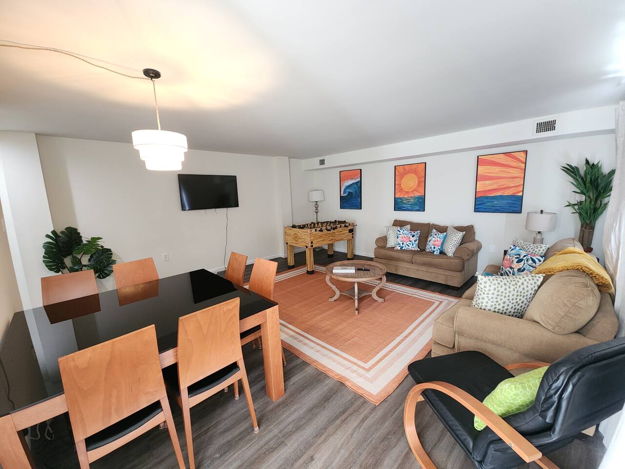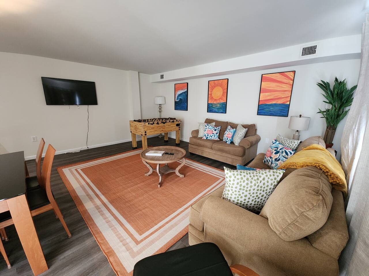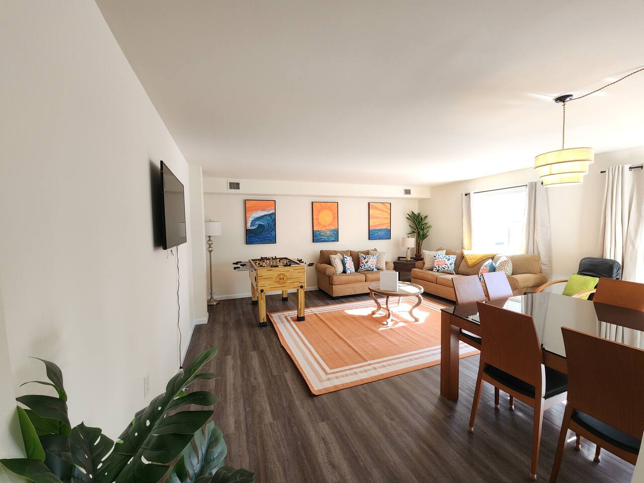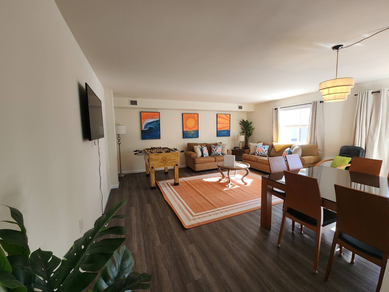 With an abundance of natural light, an outside balcony, and wonderful amenities, enjoy this space with all the comforts and convenience to make for a perfect stay. A blend of fun and serene style will greet you as you step inside. LIVING AREA: -The unit has a spacious living area with a dining table, 2 couches, a smart TV with streaming apps for your viewing pleasure (No cable, just streaming apps), and foosball table to provide fun & entertainment. ARTIST FEATURE: -Enjoy the curated canvas artwork on the living room wall specially designed just for Uptown Grove. A beautiful, vibrant sun and ocean inspired oil painted collection adorns the main wall in the living room. Custom designed and hand painted by a very talented local artist, Annalise Sylvester. KITCHEN: -The kitchen is beautiful with granite countertops, ample cabinets, new stainless steel appliances & all the features you will need to prepare meals. SLEEPING ARRANGEMENTS: -The 2nd floor has 2 spacious and stylish ensuite bedrooms which comfortably sleep up to 6 guests. -Each bedroom is tastefully designed and includes wall mounted smart TV’s and cozy bed linens. BEDROOM 1: 1 King Sized bed, desk, 2 roomy closets and a full bath with a tub. BEDROOM 2: 2 Queen Sized beds, a desk, a closet and a full bath with a stand-up shower. ADDITIONAL SLEEPING ARRANGEMENTS: Pull out sofa in the living room BALCONY: The sliding glass door opens to an outdoor balcony with bistro seating. AMENITIES: The home is also equipped with Wifi, a coffee maker, an iron and ironing board, a hair dryer and much more! LOCATION: The unit is in a complex on a beach block directly across from Ocean Resort & Casino and next to The Showboat Hotel. Take a lovely, quick stroll to the boardwalk and beach. The unit comes with one assigned parking space which will be provided to you with your check in directions. (Please note that you cannot on street park any vehicles in this vicinity. But the Ocean Casino parking garage is directly across the street if you have an additional vehicle that you require parking for.) ADDITIONAL NOTES: -Please note that like many areas of the city, the complex parking lot has the possibility of puddling or flooding when it rains. This factor is out of our control and we suggest parking at Ocean Casino across the street in the event that it becomes problematic. -The unit has central air, but being it is a 2 floor unit with 2 levels, at times the power of air conditioning may compete with heat rising. -Please excuse the complex's appearance- it is under new management and the HOA is currently doing renovations and landscaping to maintenance the building and grounds. -Grills are not permitted to be used on the property as per HOA regulations. -This unit is right next to the new Waterpark, so there is the potential of noise and foot traffic. BOOK WITH US and unlock discounts and special offers exclusive to Cozy Cohost guests. Take advantage of all that Atlantic City has to offer and enjoy savings at top local spots including famous restaurants, night clubs, spas, coffee shops, distilleries, breweries, boat tours, bike rentals, mini golf, and more...
