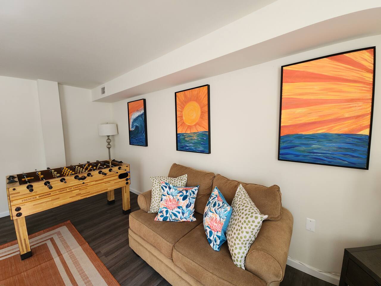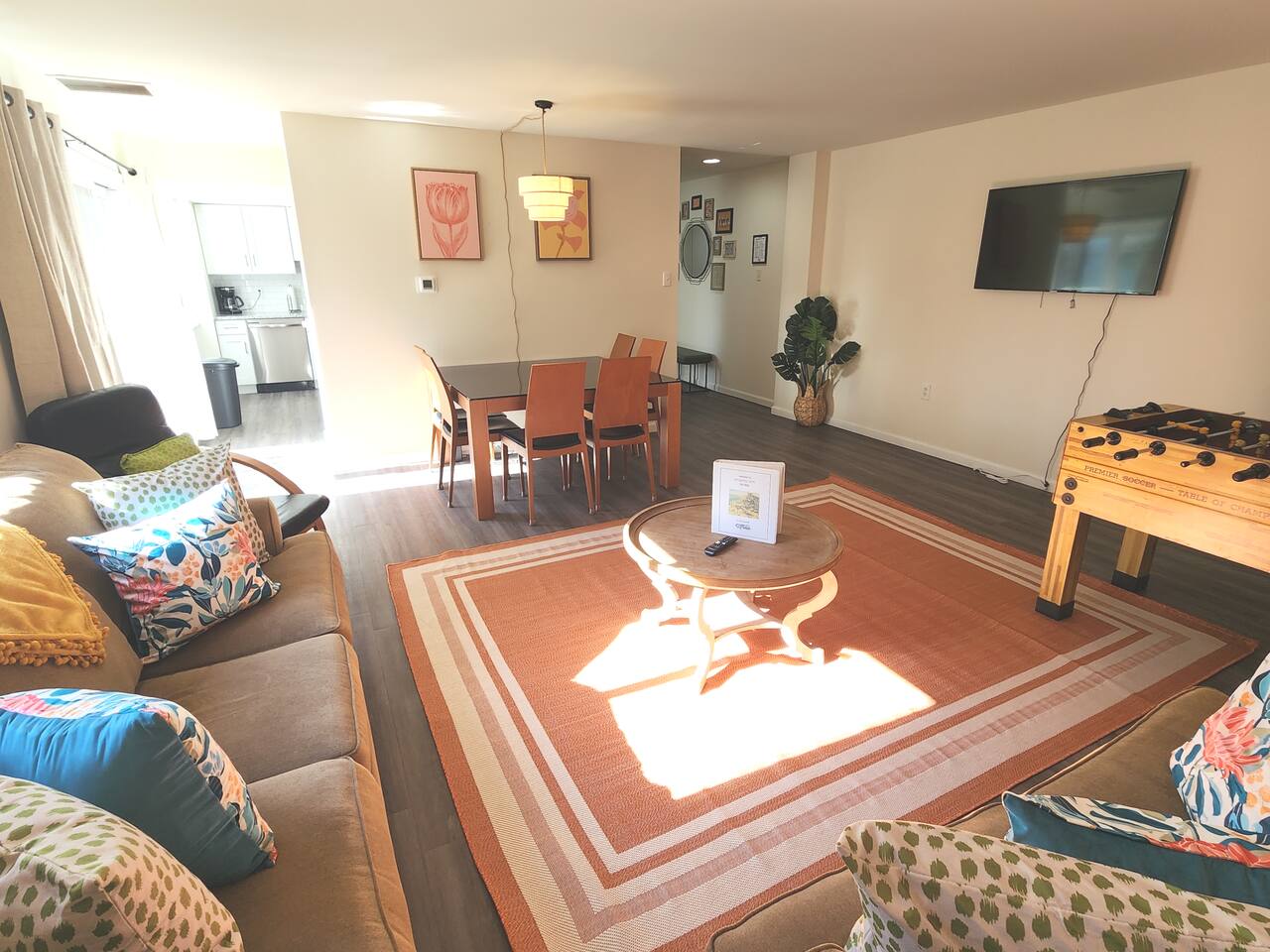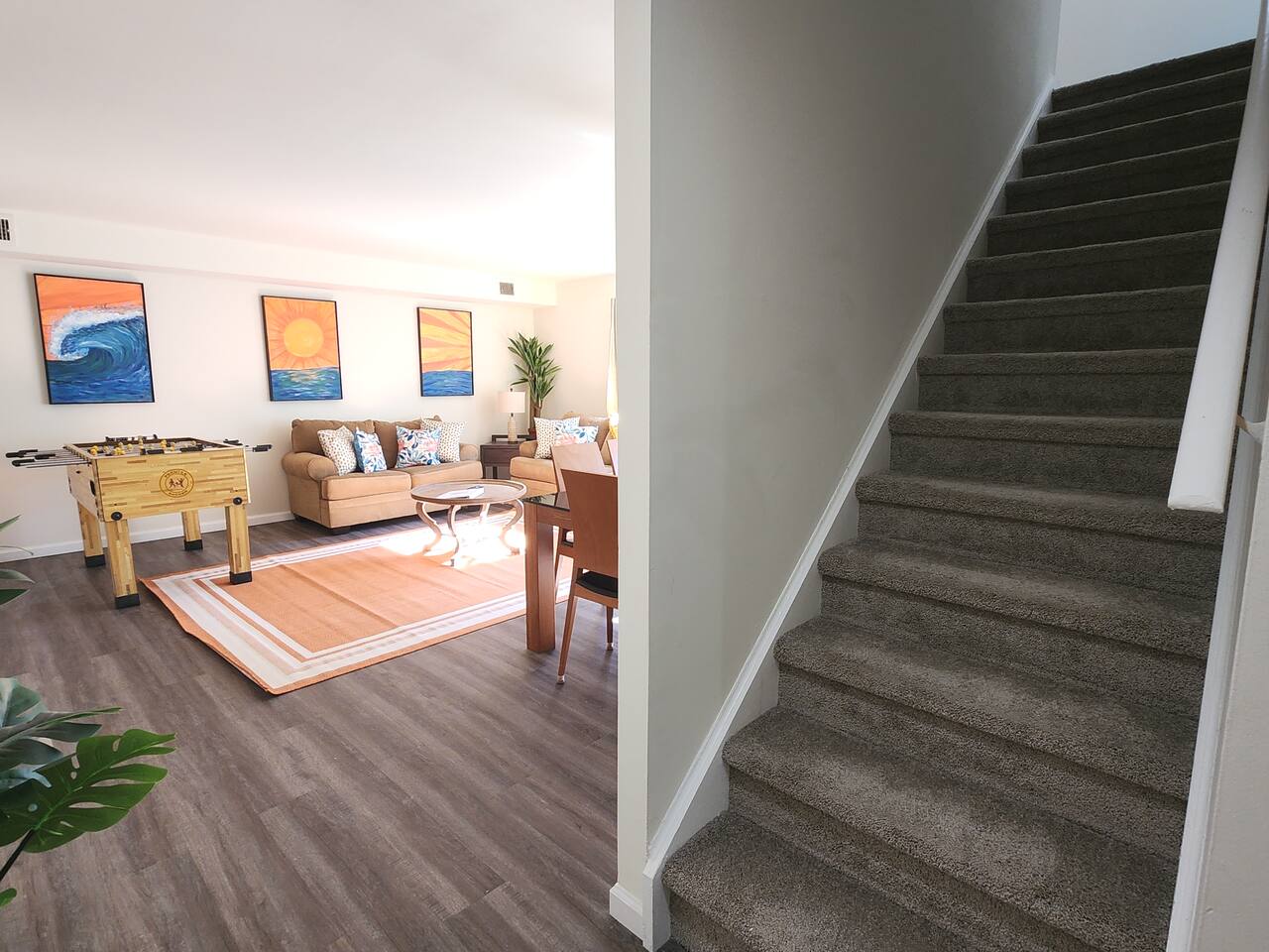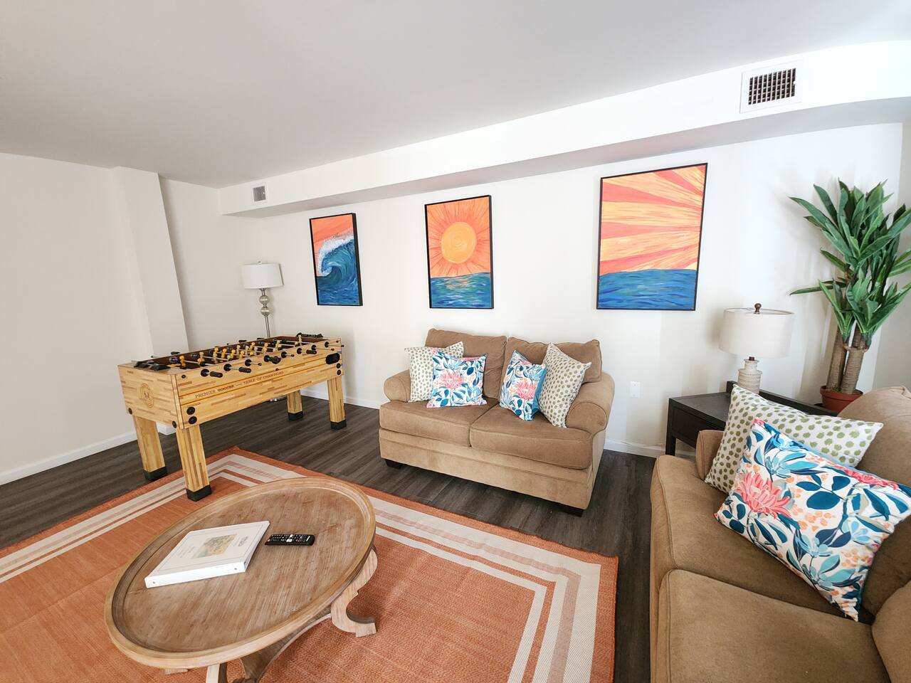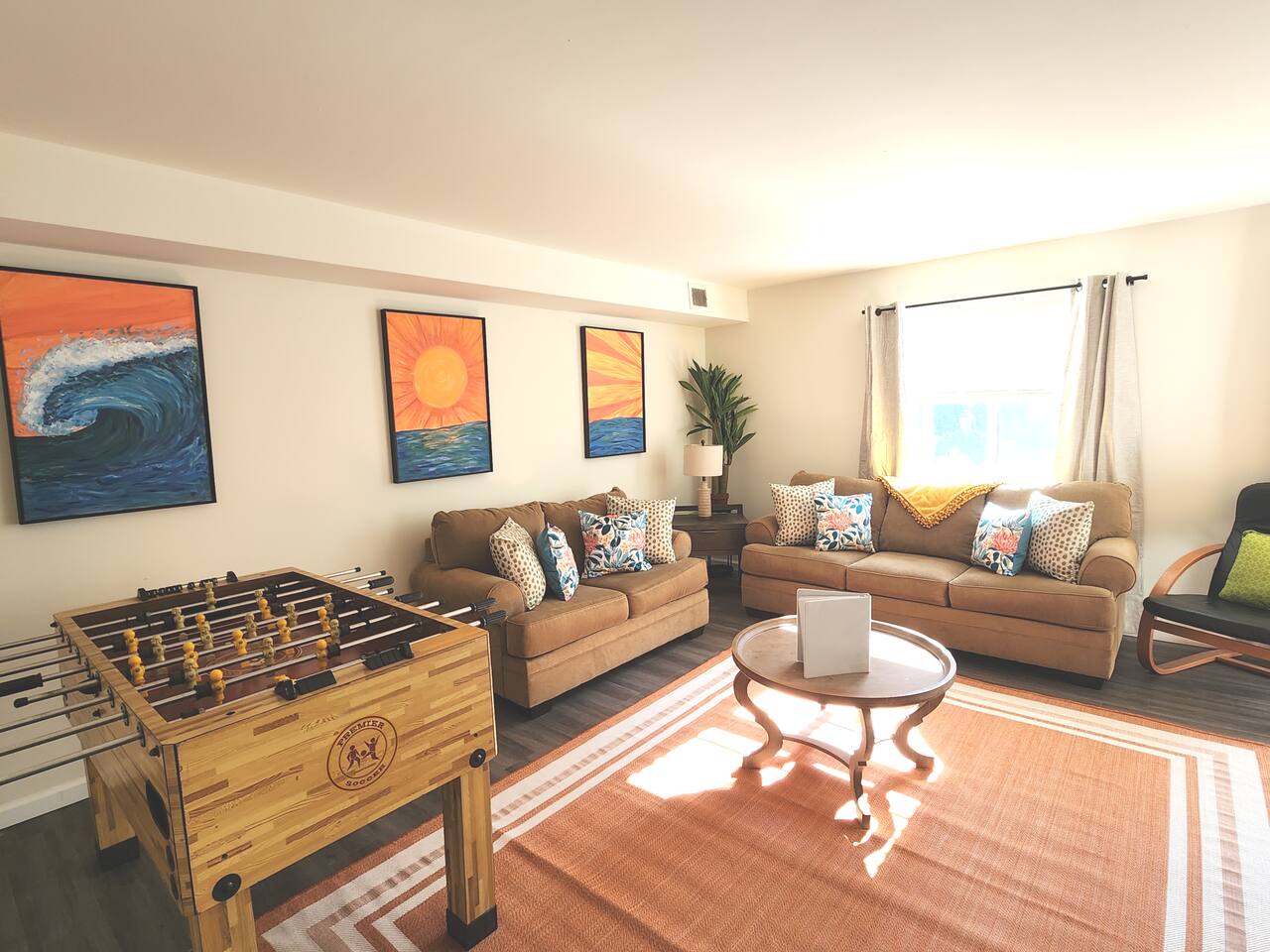 With an abundance of natural light, an outside balcony, and wonderful amenities, enjoy this space with all the comforts and convenience to make for a perfect stay. A blend of fun and serene style will greet you as you step inside. LIVING AREA: -The unit has a spacious living area with a dining table, 2 couches, a smart TV with streaming apps for your viewing pleasure (No cable, just streaming apps), and foosball table to provide fun & entertainment. ARTIST FEATURE: -Enjoy the curated canvas artwork on the living room wall specially designed just for Uptown Grove. A beautiful, vibrant sun and ocean inspired oil painted collection adorns the main wall in the living room. Custom designed and hand painted by a very talented local artist, Annalise Sylvester. KITCHEN: -The kitchen is beautiful with granite countertops, ample cabinets, new stainless steel appliances & all the features you will need to prepare meals. SLEEPING ARRANGEMENTS: -The 2nd floor has 2 spacious and stylish ensuite bedrooms which comfortably sleep up to 6 guests. -Each bedroom is tastefully designed and includes wall mounted smart TV’s and cozy bed linens. BEDROOM 1: 1 King Sized bed, desk, 2 roomy closets and a full bath with a tub. BEDROOM 2: 2 Queen Sized beds, a desk, a closet and a full bath with a stand-up shower. ADDITIONAL SLEEPING ARRANGEMENTS: Pull out sofa in the living room BALCONY: The sliding glass door opens to an outdoor balcony with bistro seating. AMENITIES: The home is also equipped with Wifi, a coffee maker, an iron and ironing board, a hair dryer and much more! LOCATION: The unit is in a complex on a beach block directly across from Ocean Resort & Casino and next to The Showboat Hotel. Take a lovely, quick stroll to the boardwalk and beach. The unit comes with one assigned parking space which will be provided to you with your check in directions. (Please note that you cannot on street park any vehicles in this vicinity. But the Ocean Casino parking garage is directly across the street if you have an additional vehicle that you require parking for.) ADDITIONAL NOTES: -Please note that like many areas of the city, the complex parking lot has the possibility of puddling or flooding when it rains. This factor is out of our control and we suggest parking at Ocean Casino across the street in the event that it becomes problematic. -The unit has central air, but being it is a 2 floor unit with 2 levels, at times the power of air conditioning may compete with heat rising. -Please excuse the complex's appearance- it is under new management and the HOA is currently doing renovations and landscaping to maintenance the building and grounds. -Grills are not permitted to be used on the property as per HOA regulations. -This unit is right next to the new Waterpark, so there is the potential of noise and foot traffic. BOOK WITH US and unlock discounts and special offers exclusive to Cozy Cohost guests. Take advantage of all that Atlantic City has to offer and enjoy savings at top local spots including famous restaurants, night clubs, spas, coffee shops, distilleries, breweries, boat tours, bike rentals, mini golf, and more...