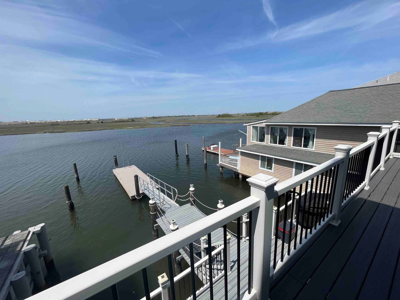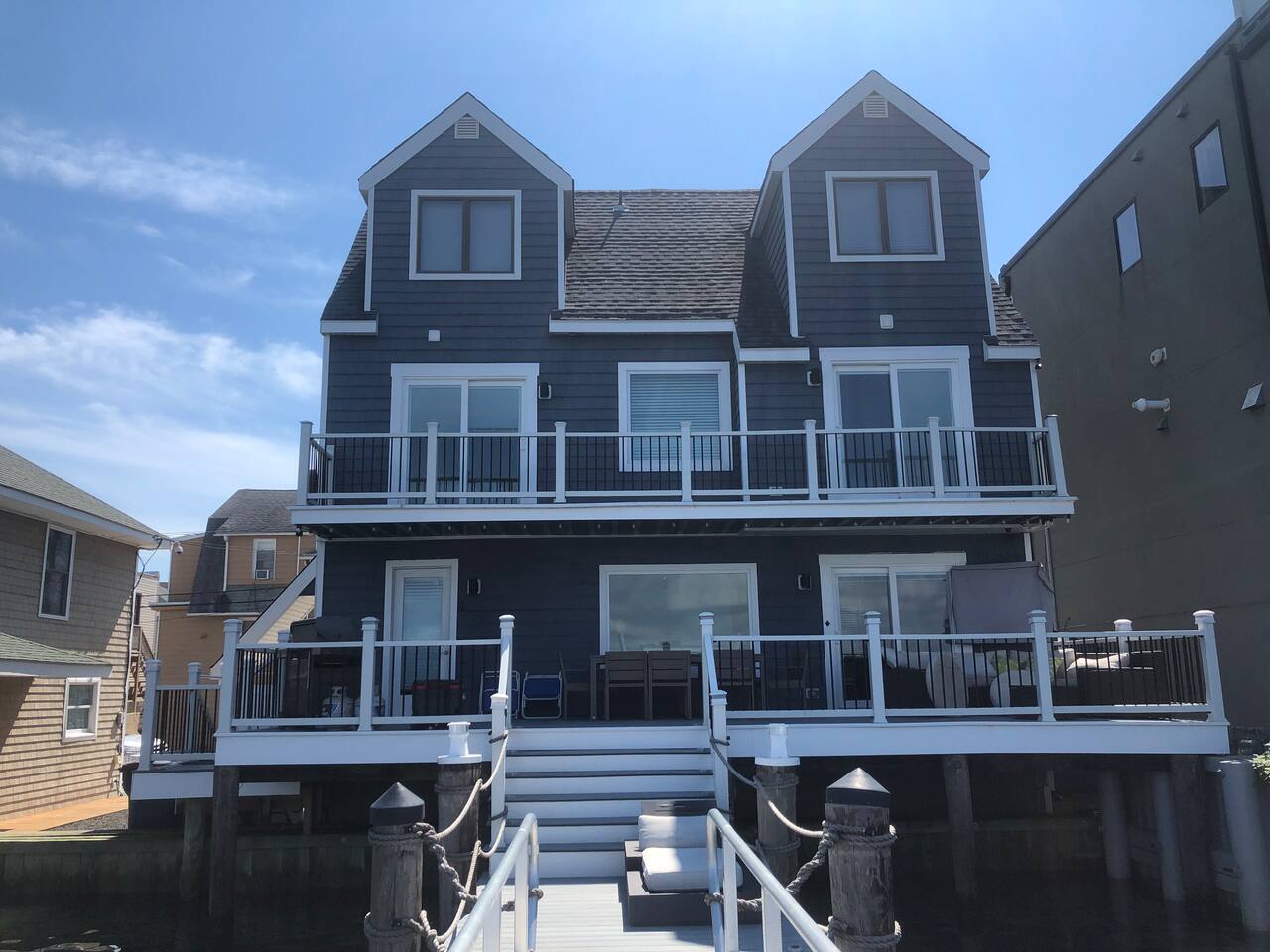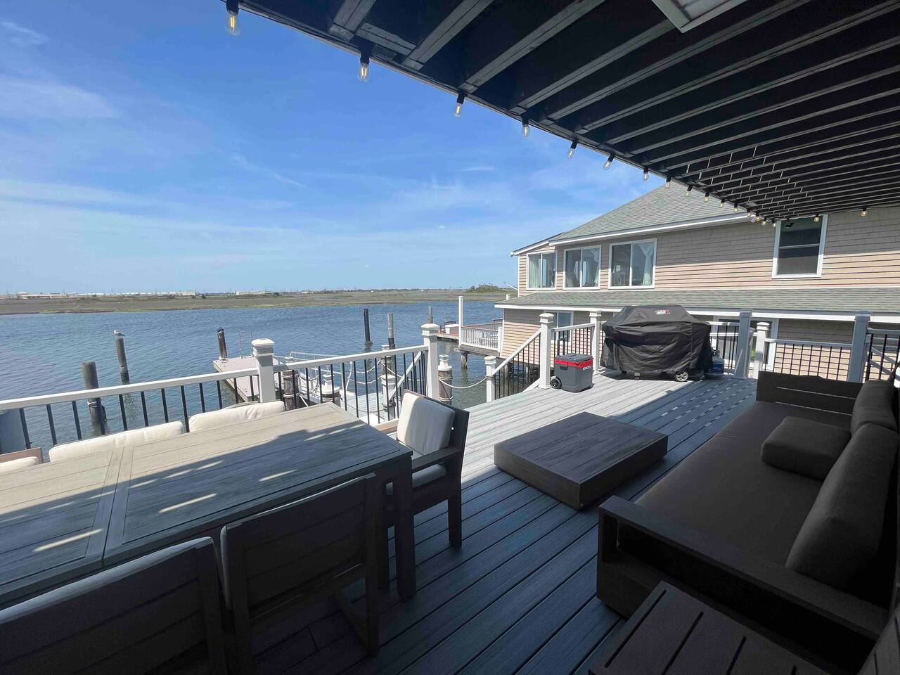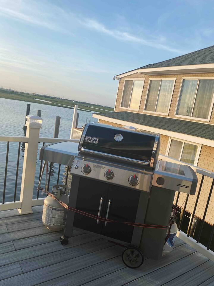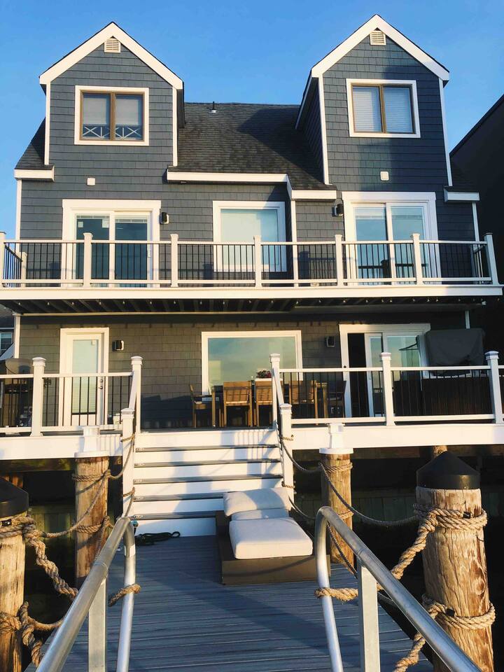 Welcome to our lovely on the bay house with beautiful water views! Featuring 4 bedrooms, 2 full bathrooms, and 2 half-baths. Get ready to feel at home in a comfortable setting with many wonderful amenities to offer. Right at the water's edge! The cozy bedrooms, dining area, galley kitchen, and living room all have water views of the Bay. FIRST FLOOR: Half Bath, Kitchen, Dining Area, Living Room and Laundry Room. Main Deck and Dock Access. SECOND FLOOR: Bedroom 1 - 1 King Sized bed w/ ensuite full bath, upper deck access Bedroom 2 - 1 Queen Sized bed, upper deck access 1 Full Bathroom in Hallway THIRD FLOOR: Bedroom 3 and 4 - Each has 1 Queen Bed and an adjoining half bath ADDITIONAL SLEEPING: A Queen air mattress is provided for additional sleeping. AMENITIES: -There are smart TVs in the living room and each bedroom (no cable, just streaming apps). -There is a BBQ grill available for use. -You can watch your favorite show outside the patio from our outdoor TV. -Whether indoors or outdoors, all the spaces of this property are wonderful to enjoy with family or friends to create many memories! DOCK: -The large dock is deepwater.....bring your boat! -PLEASE BE ADVISED THAT ANY USE OF THE DOCK IS IT AT YOUR OWN RISK. -If you would like to bring your boat, we are happy to accommodate but we do request a waiver to be signed. LOCATION: -It is located in the heart of Ventnor City within walking distance from the beach and boardwalk. -A short drive to the Atlantic City Boardwalk, The Casinos, The Walk at Tanger Outlets, Steel Pier Amusement Pier and much more. -Perfect for a big family or groups of friends coming on a retreat. -A large pavilion and picnic area are also adjacent to the property. ENVIRONMENTAL NOTES: -Proximity to the bay may lead to coastal flooding; the street and other roadways may become inaccessible. We will provide guidance and recommend parking if needed. SMOKING/PETS: -There is NO SMOKING OR PETS permitted in this property. -If you smoke outdoors, please be respectful and dispose of any cigarettes properly. BOOK WITH US and unlock discounts and special offers exclusive to Cozy Cohost guests. Take advantage of all that Atlantic City has to offer and enjoy savings at top local spots including famous restaurants, night clubs, spas, coffee shops, distilleries, breweries, boat tours, bike rentals, mini golf, and more...