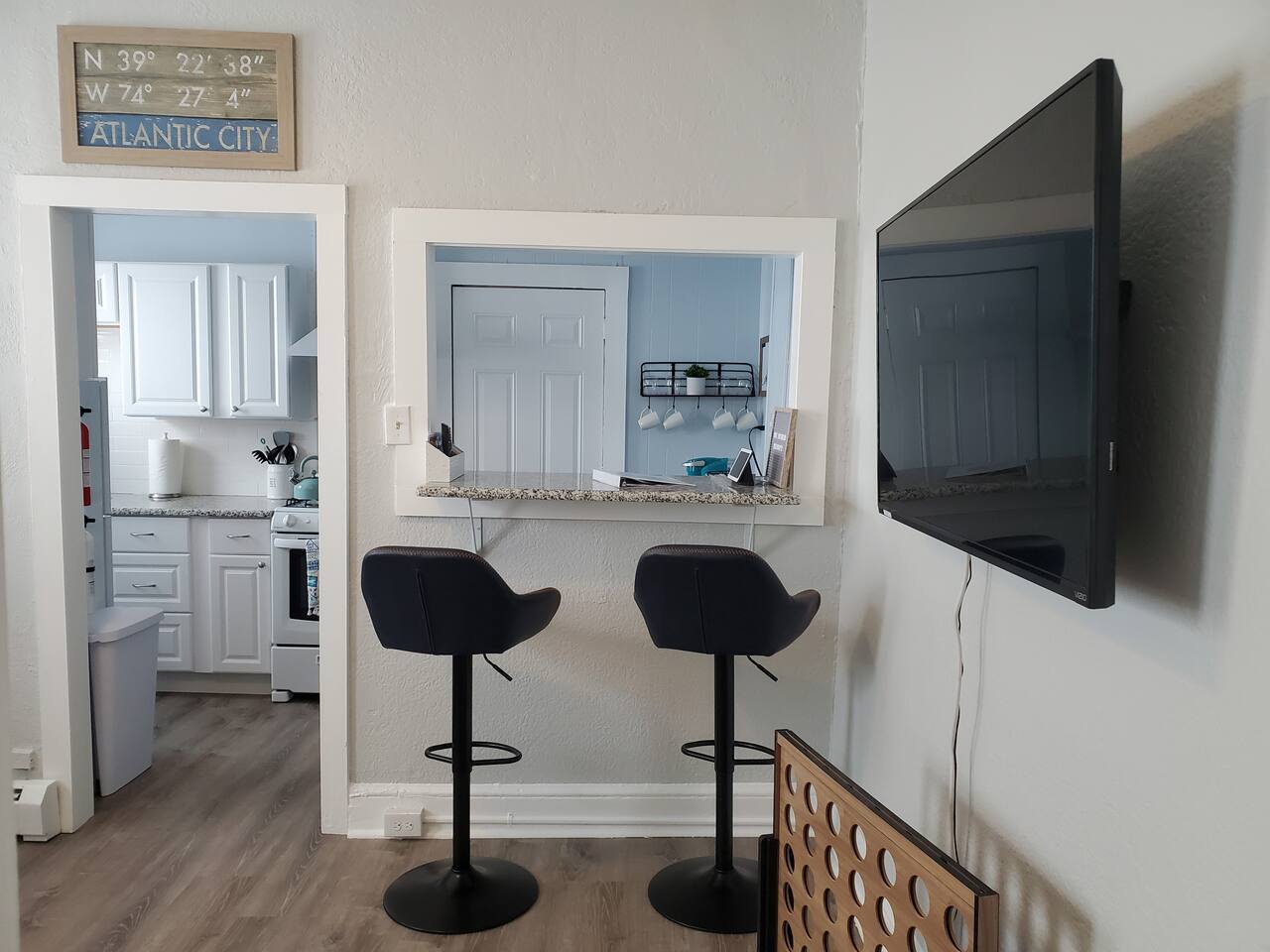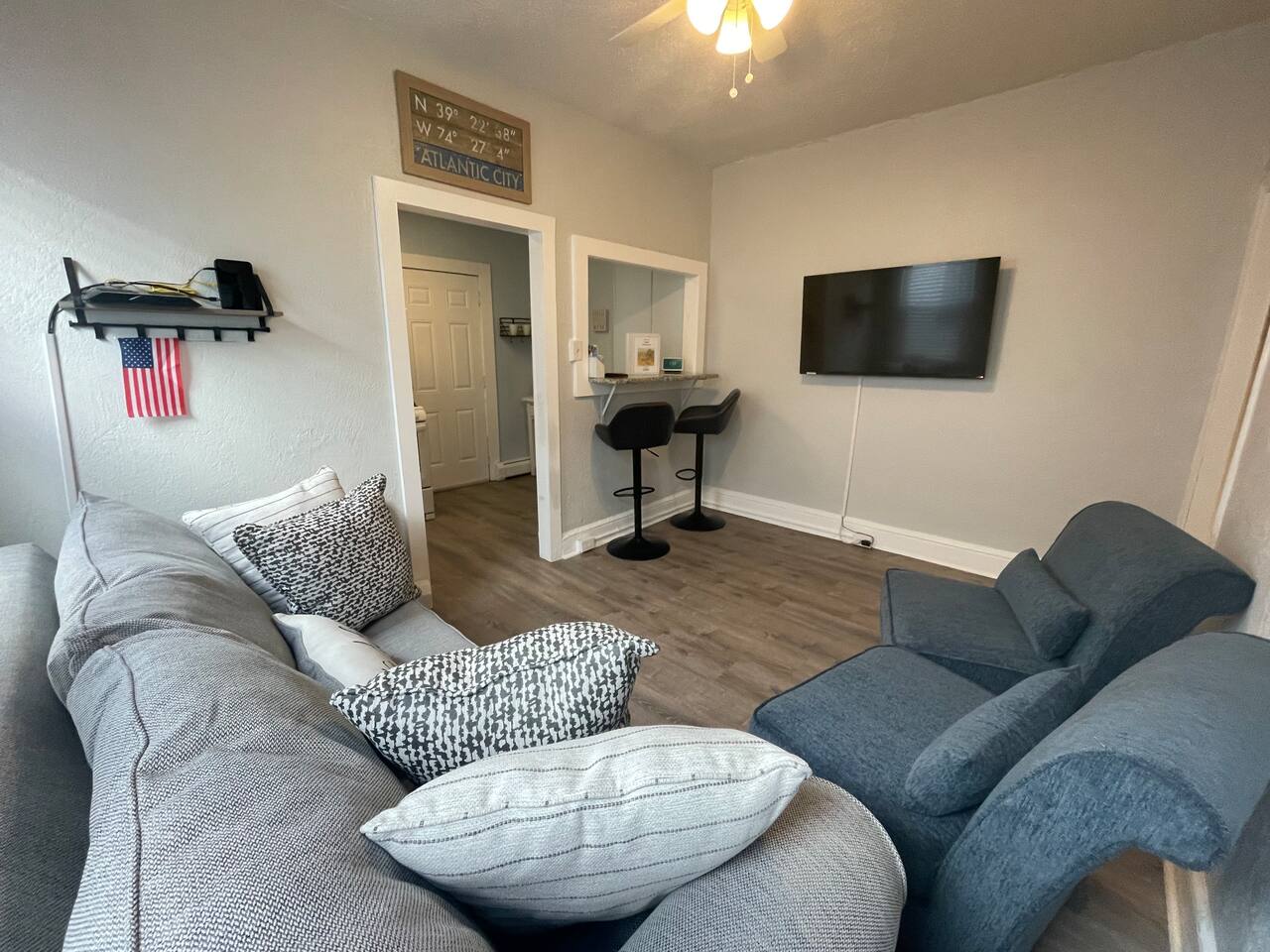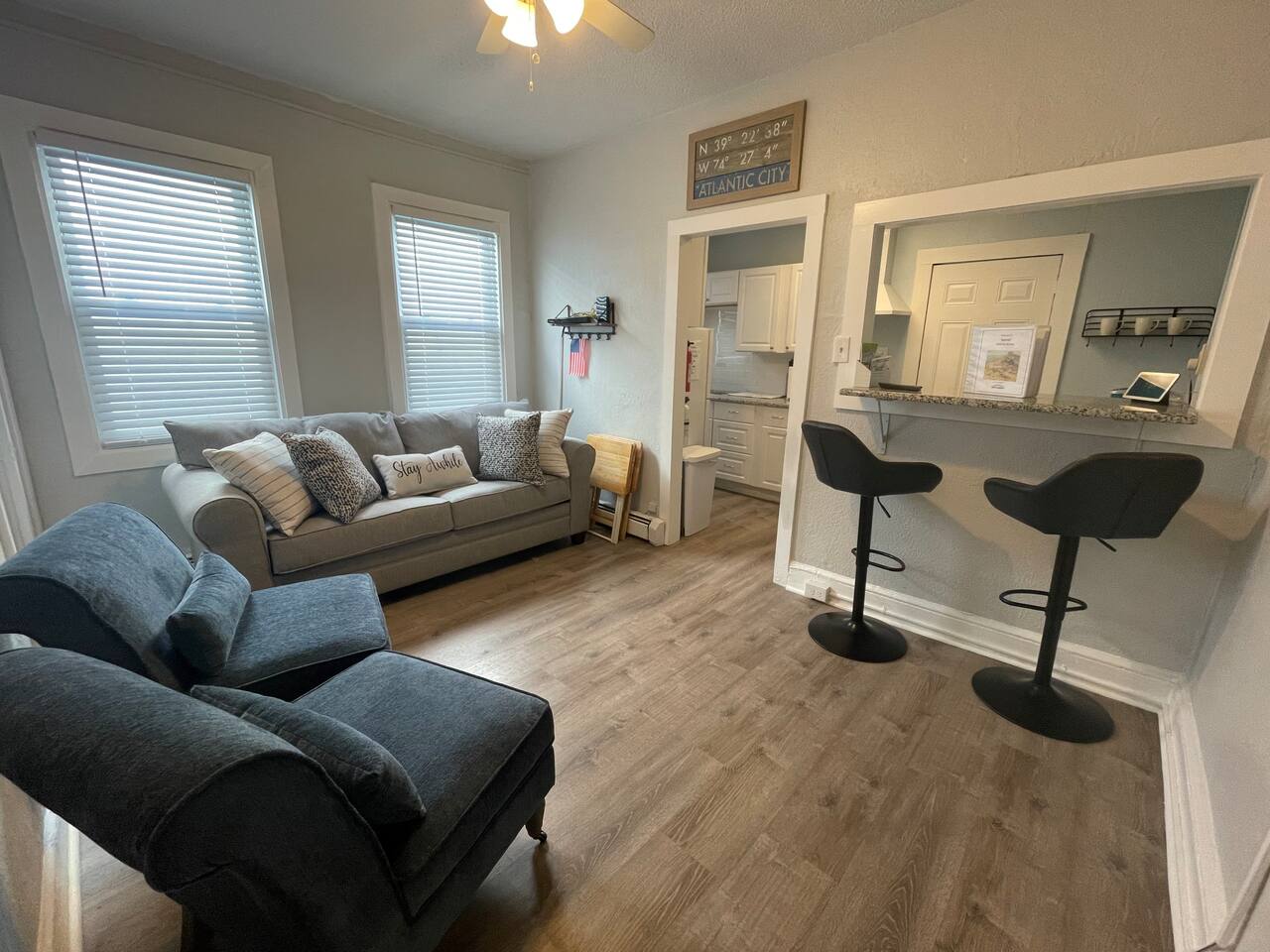 This sunny beach apartment is the upper level of a Duplex. Step into a cozy space with 2 Bedrooms and 1 Full Bathroom. It is on the smaller side, but very cozy and in a great vicinity to the boardwalk and beach! SLEEPING ARRANGEMENTS: -Both bedrooms are adorned with cozy linens. -Each bedroom has a smart TV for your viewing pleasure (no cable, just streaming apps). BEDROOM 1: 1 King Size Bed BEDROOM 2: 1 Queen Size Bed KITCHEN: -The kitchen is brand new, fully stocked with amenities and new appliances. -There is an eating nook with 4 modern high stools and a charming coffee station perfect for a morning cup of brew. LIVING ROOM: -The Living room is cozy with a pull out couch and large smart TV. AMENITIES: -The home is also equipped with Wifi, several games, a Keurig coffee maker, an iron and ironing board, air conditioning/heat and much more! -The apartment has it's own thermostat for temperature controls. LOCATION: -This property is in a great vicinity to all that Atlantic City has to offer! Practically beachside, you can enjoy the sun and ocean, stroll the boardwalk and piers, visit eateries and bars, gamble at the nearby Casinos and shop till you drop at the Tanger Outlets. PLEASE NOTE: - This property is part of an attached duplex, meaning it shares walls with neighboring units. While we strive to provide a peaceful and comfortable stay, occasional noise or scents from adjacent units may be noticeable. These occurrences are outside of our control and are a natural aspect of shared-wall living. If this could impact your enjoyment, this property may not be the best fit for your stay. -Since this is the upstairs unit, please keep in mind that noise may be heard from the unit below or the property next door. -This property is a few feet from the beach and Boardwalk, and it is easy to track sand into the unit. -It is common that winds from the ocean might blow some sand through the window air conditioning vents or if exterior doors are left open. **We take the cleanliness and presentation very seriously. We have experienced this ongoing issue, and like to make guests aware of in the event they experience it. -Please be aware, parking can be quite difficult. We strive to provide parking permits for the street, however if misplaced, the city does not replace them. Therefore, we cannot guarantee their availability if a guest misplaces or takes them with them. There is a $100 fee for any misplaced permits. BOOK WITH US and unlock discounts and special offers exclusive to Cozy Cohost guests. Take advantage of all that Atlantic City has to offer and enjoy savings at top local spots including famous restaurants, night clubs, spas, coffee shops, distilleries, breweries, boat tours, bike rentals, mini golf, and more...