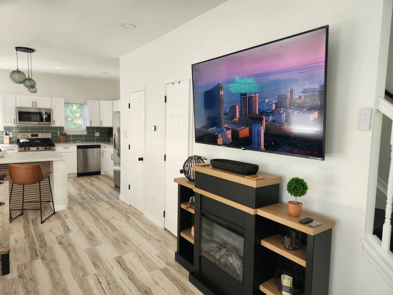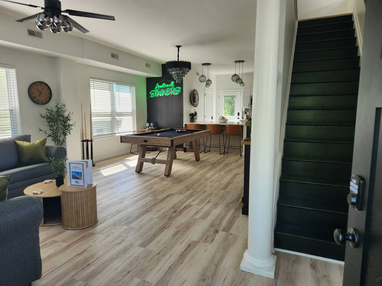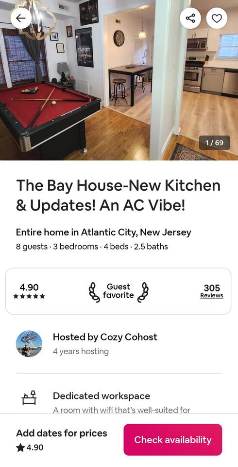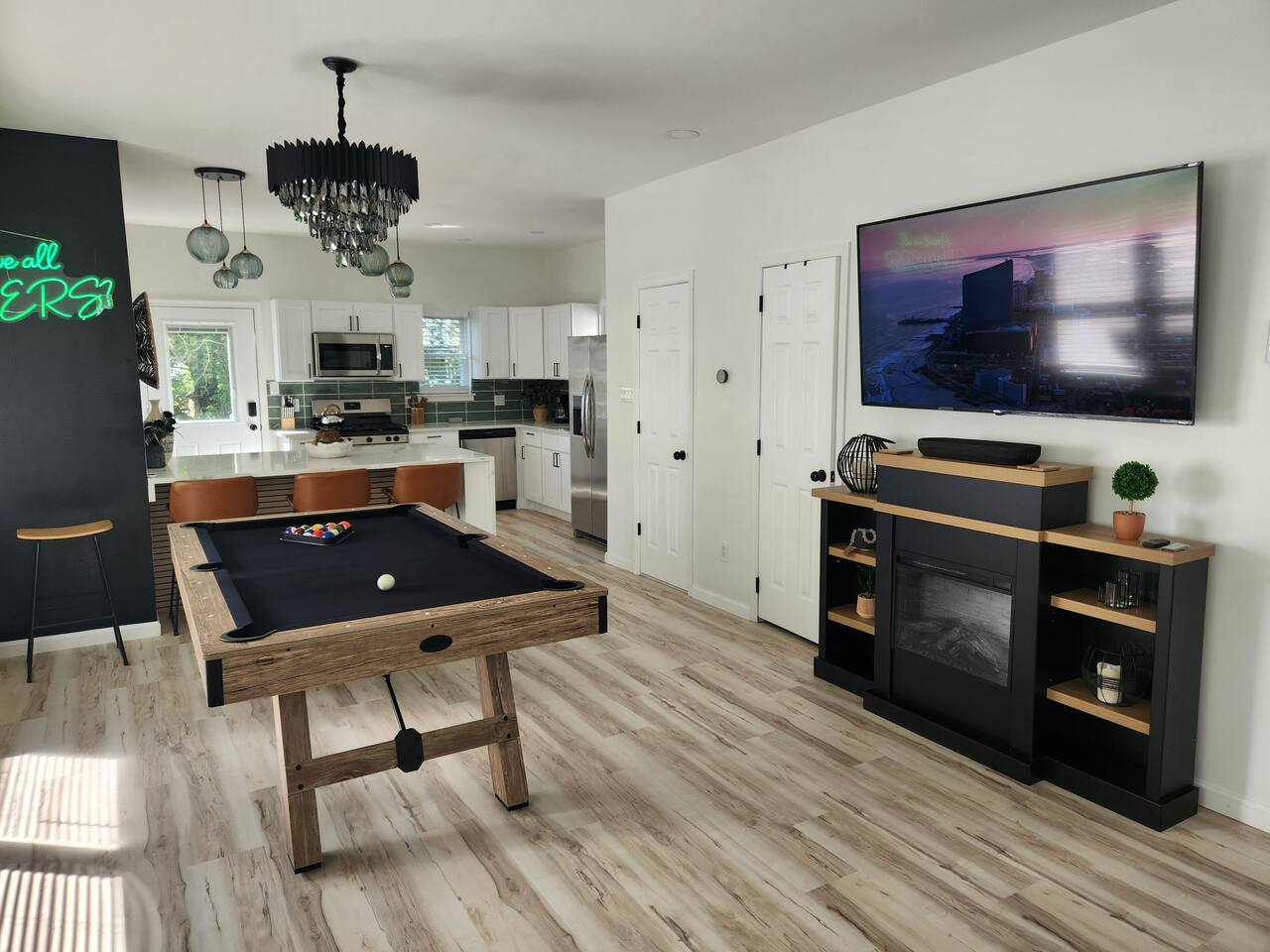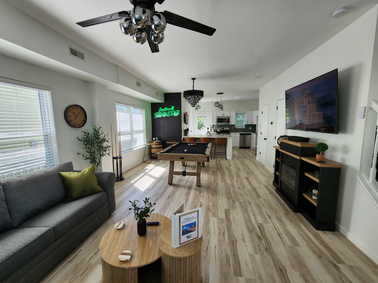 Newly renovated, brand new, wonderful 3 bedroom home in a quiet neighborhood surrounded by the beautiful inlets of AC. MAIN LEVEL: Spacious open concept style main living area with spacious sectional couch, large smart TV, electric fireplace, pool table, large island with seating and a brand new kitchen. SLEEPING ARRANGEMENTS: BEDROOM 1- 1 King Sized bed, Smart TV, ensuite full bathroom with stand up shower. BEDROOM 2- 1 Queen Sized bed, Smart TV BEDROOM 3- 1 Queen Sized bed, Smart TV BATHROOMS: (2.5 baths total) - Half bath on the main level next to the kitchen - Full bath ensuite in the master bedroom with stand up shower - Full bath in the upstairs hallway with tub and shower ADDITIONAL NOTES: -This home is ideal for families or groups and includes an 8 foot pool table, WiFi, full kitchen with all brand new stainless appliances, washer and dryer, smart TV with streaming apps for your viewing pleasure (no cable, just streaming apps), and much more! AMENITIES: -The home is also equipped with Wifi, a standard drip coffee maker, an iron and ironing board, a hair dryer and much more! -There is a basic charcoal grill for guests to use. -Please note that we do not supply charcoal or lighter fluid. Guests must supply their own. - There is a fire pit in the backyard with adirondack chair seating around -The pool table will provide loads of fun! BOOK WITH US and unlock discounts and special offers exclusive to Cozy Cohost guests. Take advantage of all that Atlantic City has to offer and enjoy savings at top local spots including famous restaurants, night clubs, spas, coffee shops, distilleries, breweries, boat tours, bike rentals, mini golf, and more...